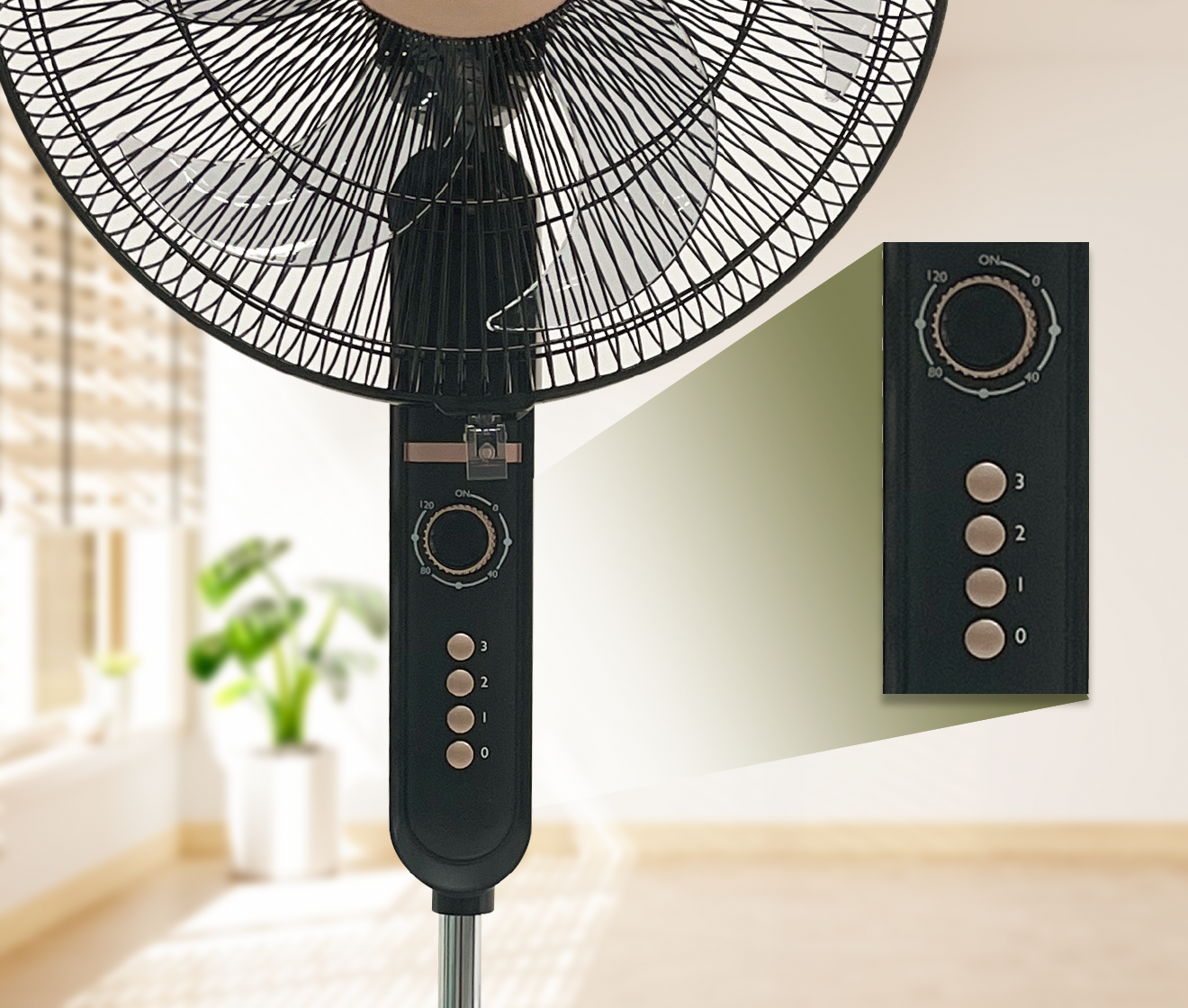 Mô tơ không chổi than DC bền bỉ tiết kiệm điện. ·        Điều chỉnh hướng gió lên xuống. ·        Có thể đặt nhiều tốc độ khác nhau và có điều khiển. ·        Ba cánh quạt bằng nhôm. ·        Thiết kế hình tròn dáng cái trống bằng kim loại. ·        Lồng quạt hình xoáy lò xo. ·        Đế quạt bằng kim loại chắc chắn kèm chân chống đổ. ·        Nguồn điện vào: 220-240V, 50/60Hz. ·        Nguồn ra: DC 12.6V, 1.5A. ·        Công suất: 25W.