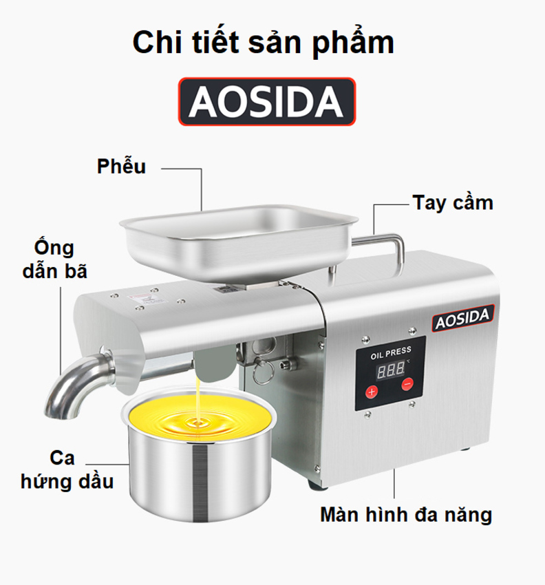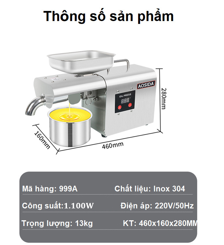 - Vấn đề sức khỏe hiện nay đang rơi vào tình trạng đáng báo động khi, các chủ cơ sở sản xuất, hộ kinh doanh dầu ăn chỉ chạy theo lợi nhuận mà bất chấp cung cấp ra thị trường các loại dầu ăn giả, kém chất lượng, gây tổn hại đến sức khỏe và tính mạng người tiêu dùng. Cách tốt nhất bảo vệ bản thân và mọi người trong gia đình đó chính là tự ép dầu thực vật ngay tại nhà. Giới thiệu máy ép dầu thực vật nóng và lạnh dùng trong gia đình Aosida 999A là dòng sản phẩm nâng cấp từ mã 888A với công suất và chất lượng vượt trội như: Công suất cao, màn hình điện tử dễ dàng thao tác, buồng ép lớn cho ra dầu trong hơn, ép nóng và lạnh, hoạt động liên tục 24h.... [ƯU ĐIỂM]