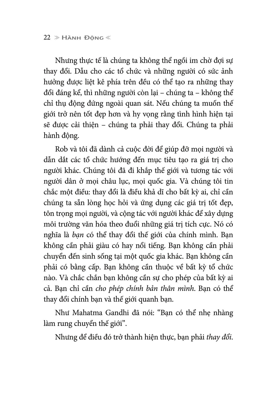 HÀNH ĐỘNG Hành trình tạo nên những thay đổi tích cực Nếu thay đổi là điều khả dĩ, vậy tại sao chúng ta lại không cố gắng làm nhiều thứ hơn để có thể thay đổi cả thế giới? Thực tế là phần lớn chúng ta thường chờ đợi ai khác sẽ làm gì đó, thay chúng ta giải quyết các vấn đề. Chúng ta muốn thay đổi nhưng lại hy vọng ai đo ở nơi nào đó sẽ làm gì đó để đem lại sự thay đổi giống như ta mong muốn. Nếu bạn đang trên con đường thay đổi thế giới của riêng mình, chúng tôi hy vọng có thể giúp bạn làm tốt hơn nữa. Nếu bạn vẫn chưa tạo nên được thay đổi tích cực trong cuộc sống của người khác, hy vọng có thể khuyến khích bạn bắt đầu, và chúng tôi muốn giới thiệu cho bạn các cách để chủ động tạo ra giá trị tốt đẹp cho những người khác. Và quyển sách này – Change Your World: How Anyone, Anywhere Can Make a Difference sẽ giúp bạn mở mang tầm mắt, để bạn có thể nhìn môi trường xung quanh với một góc nhìn thật khác biệt – đó là tiền đề cho quá trình thay đổi cách sống và thậm chí là biến đổi thế giới xung quanh bạn. “Hành động” – Bản chỉ dẫn bạn đạt được mục tiêu của mình Tác giả John C. Maxwell và Rob Hoskins của cuốn sách này đã dành cả cuộc đời để giúp đỡ mọi người và dẫn dắt các tổ chức hướng đến mục tiêu tạo ra giá trị cho người khác. 2 người đã đi khắp thế giới và tương tác với người dân ở mọi châu lục, mọi quốc gia. Và họ tin chắc một điều: thay đổi là điều khả dĩ cho bất kỳ ai, chỉ cần chúng ta sẵn lòng học hỏi và ứng dụng các giá trị tốt đẹp, tôn trọng mọi người, và cộng tác với người khác để xây dựng môi trường văn hóa theo đuổi những giá trị tích cực. Nó có nghĩa là bạn có thể thay đổi thế giới của chính mình. Bạn không cần phải giàu có hay nổi tiếng. Bạn không cần phải chuyển đến sinh sống tại một quốc gia khác. Bạn không cần phải có bằng cấp. Bạn không cần thuộc về bất kỳ tổ chức nào. Và chắc chắn bạn không cần sự cho phép của bất kỳ ai cả. Bạn chỉ cần cho phép chính bản thân mình. Bạn có thể thay đổi chính bạn và thế giới quanh bạn. Những gì tác giả chia sẻ đều xuất phát từ trái tim, từ quyết tâm muốn thay đổi thế giới, biến thế giới này thành nơi tốt đẹp hơn, và từ kinh nghiệm mà họ tích lũy được thông qua hàng chục năm đầu tư vào các lĩnh vực liên quan đến con người. “Hành động – Hành trình tạo nên những thay đổi tích cực” khuyến khích và giúp bạn chuẩn bị hành trang cần thiết cho quá trình trở thành người xúc tác cho các biến đổi trong thế giới của bạn: gia đình, nơi làm việc và cộng đồng.