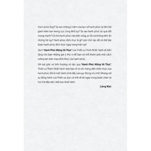 Với Hạnh Phúc Mộng Và Thực, thiền sư Thích Nhất Hạnh sẽ tặng cho bạn những gợi ý thú vị để bạn có thể khám phá một cách tường tận diện mạo địch thực của hạnh phúc.