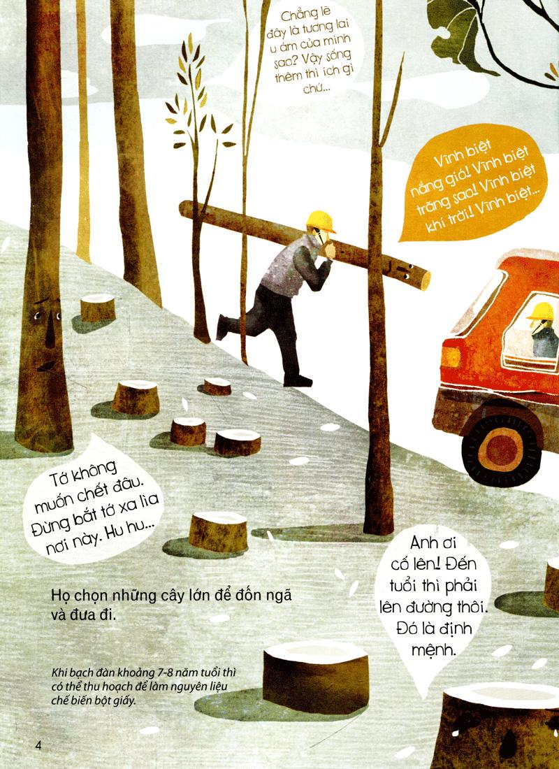 Bạch Đàn sống với đại gia đình ở ven rừng. Một hôm Bạch Đàn bị người ta đốn lìa khỏi gốc và đưa đi xa. Cậu ta rất hoảng sợ, tưởng mình bị tước đi sự sống. Thế rồi tại nhà máy nọ, trải qua bao phen gian khó tới tột cùng, Bạch Đàn được tái sinh dưới một hình hài mới, đẹp đẽ và vô cùng hữu ích. Bạn có biết đó là gì không?
