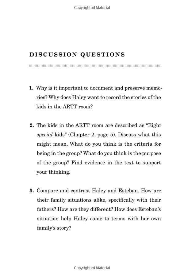 It all starts when six kids have to meet for a weekly chat--by themselves, with no adults to listen in. There, in the room they soon dub the ARTT Room (short for A Room to Talk), they discover it's safe to talk about what's bothering them--everything from Esteban's father's deportation and Haley's father's incarceration to Amari's fears of racial profiling and Ashton's adjustment to his changing family fortunes. When the six are together, they can express the feelings and fears they have to hide from the rest of the world. And together, they can grow braver and more ready for the rest of their lives.