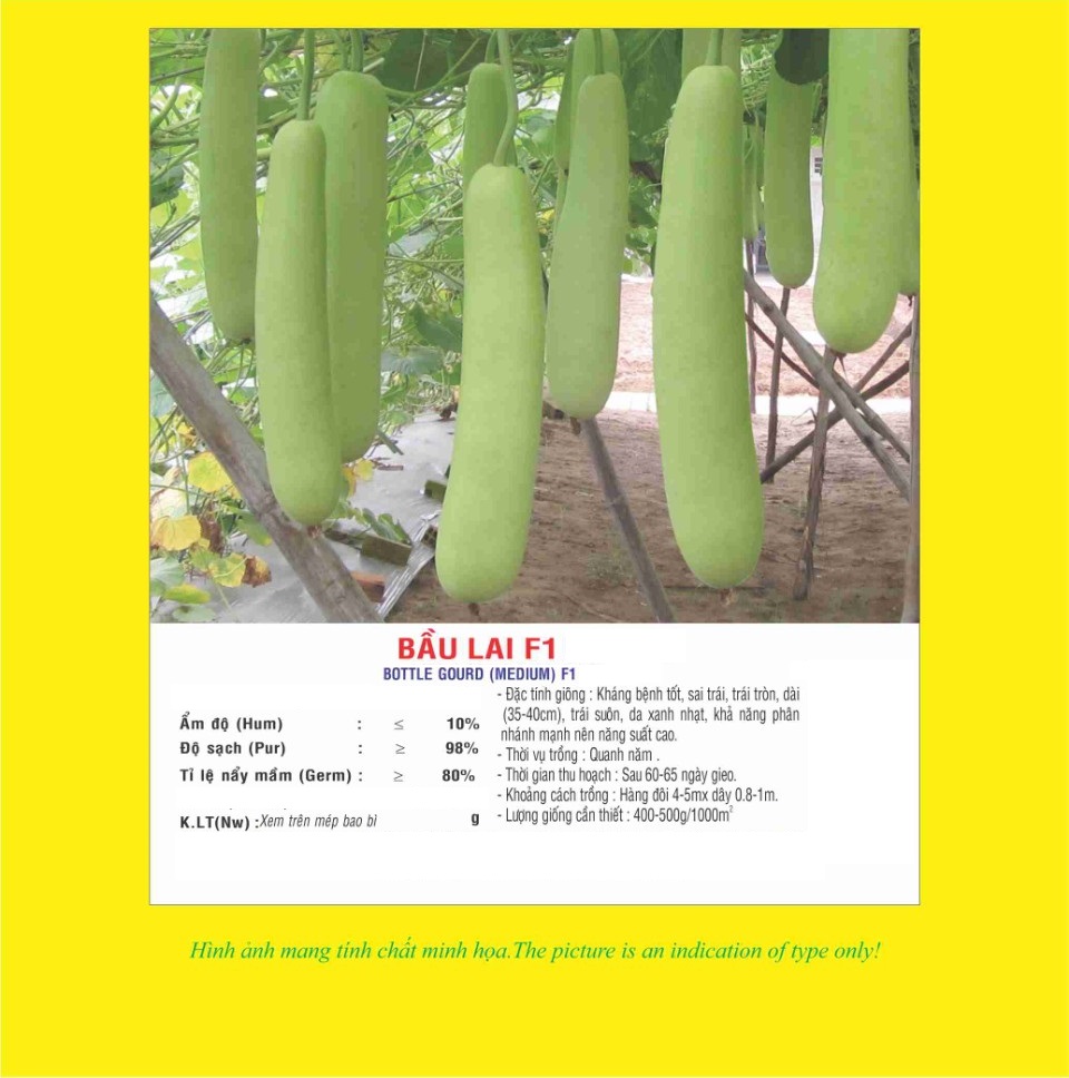 Đặc tính giống: Bầu lai - Giống ngắn ngày, kháng bệnh tốt, sai trái, trái dạng tròn dài 35-40cm, da xanh nhạt, khả năng phân nhánh mạnh nên năng suất cao