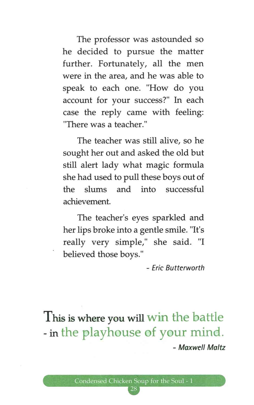 Thông qua những câu chuyện, bạn có thể tìm lại chính mình, có thêm niềm tin, nghị lực để thực hiện những ước mơ, khát vọng, biết chia sẻ và đồng cảm với nỗi đau của những người xung quanh, cảm nhận được giá trị đích thực của cuộc sống. Đó chính là điều giúp cho bộ Chiken Soup for the Soul tồn tại mãi với thời gian và trong lòng người.