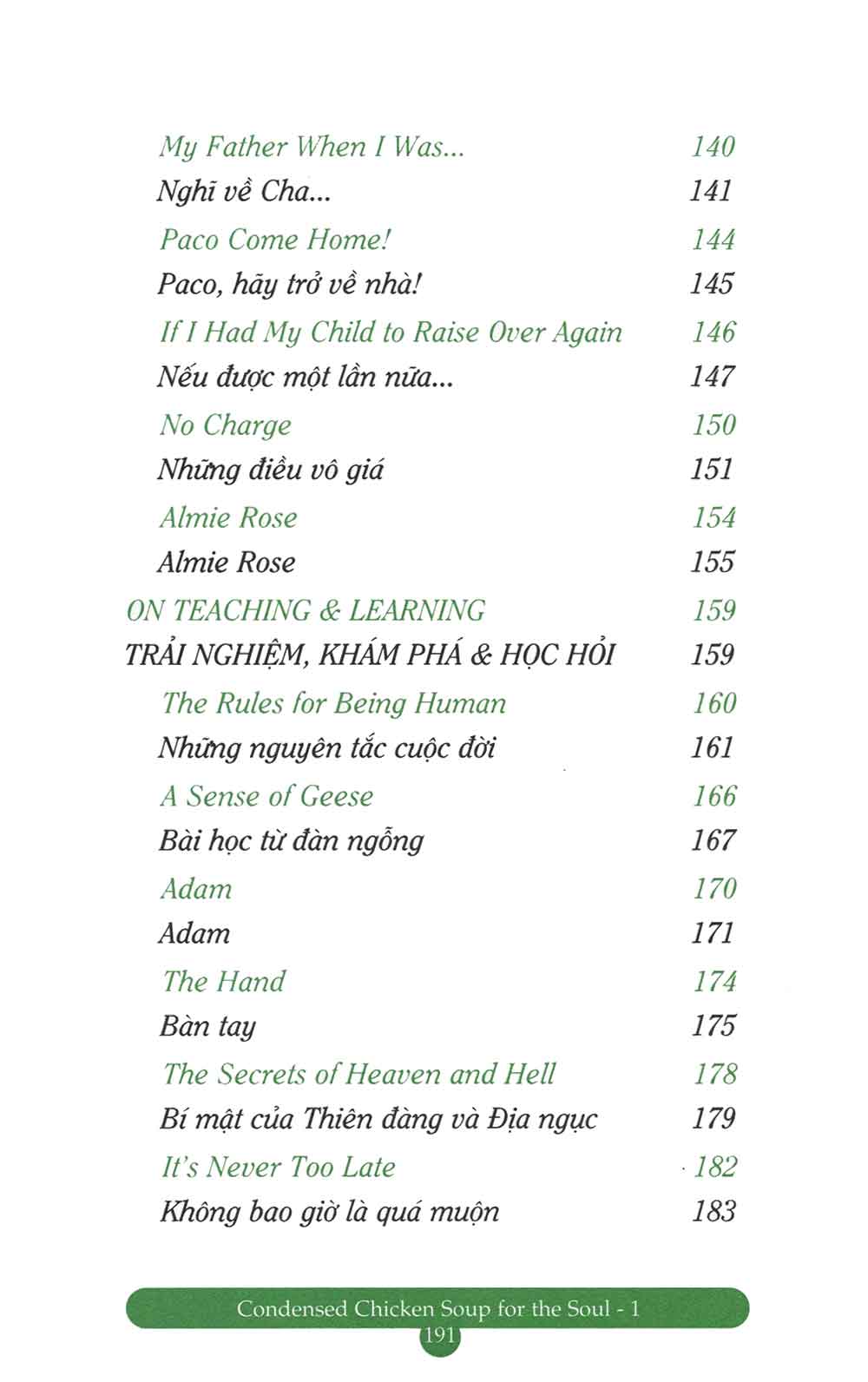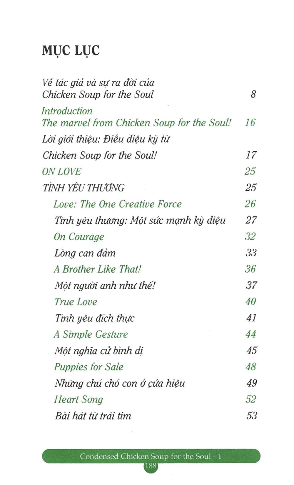 Chicken Soup for the Soul đã trở thành một thương hiệu lớn có giá trị không chỉ về mặt thương mại mà còn ở tính nhân văn cao đẹp. Những câu chuyện về tình yêu thương, về sự quan tâm của cha mẹ, về sự trải nghiệm khám phá và học hỏi trong bộ sách này sẽ khơi dậy khát vọng trong bạn, thôi thúc bạn dang rộng cánh tay chia sẻ đầy yêu thương với bạn bè và người thân, sẽ là niềm an ủi, xoa dịu những khi bạn căng thẳng tinh thần, sẽ làm bạn bừng sáng với những thời khắc của sự vượt lên chính mình và thức tỉnh cảm nhận. Chúng sẽ khuyến khích bạn kiên trì nuôi dưỡng, dám sống với ước mơ, sẵn sàng vượt qua những khó khăn, thử thách mà bạn chắc chắn sẽ gặp phải trên cuộc hành trình biến ước mơ thành hiện thực. Mỗi câu chuyện là một thông điệp có thể hàn gắn vết thương, làm thay đổi suy nghĩ, tâm hồn và đôi lúc, cả cuộc đời bạn.”