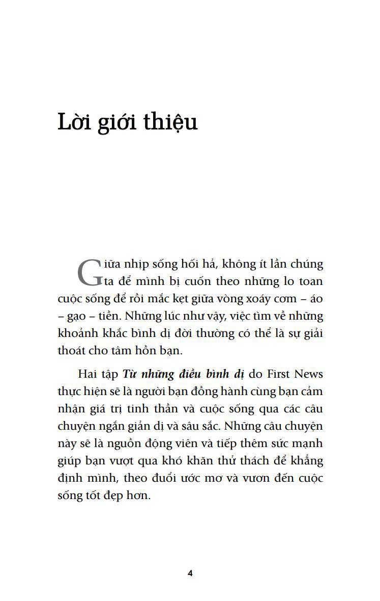 Trong lần tái bản này, tuyển tập Từ những điều bình dị có thay đổi về thiết kế và chỉnh sửa, bổ sung nội dung. Mong rằng cuốn sách tiếp tục là món quà tinh thần ý nghĩa để bạn đọc được tiếp thêm sức mạnh, niềm tin, lòng dũng cảm và tình yêu cuộc sống từ chính những mối quan hệ bình dị, gần gũi nhất trong cuộc sống.