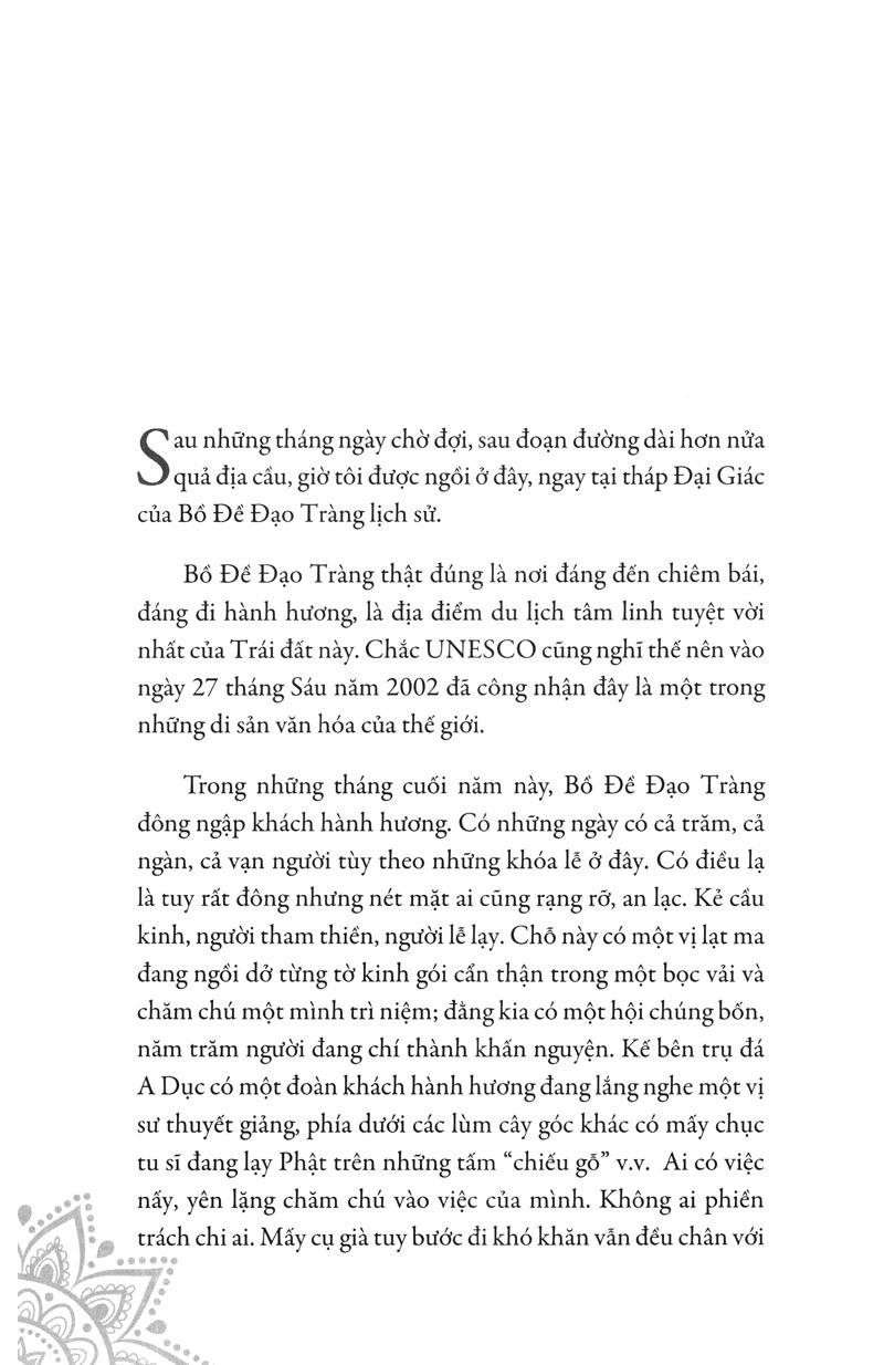Tôi luôn tin tưởng sâu sắc vào lý nhân duyên. Mười lăm bài tản văn trong tập sách này có được là nhờ những duyên lành sau một chuyến hành hương huân tu tại Ấn Độ. Cũng có thể gọi là du ký hay ký sự hành hương.