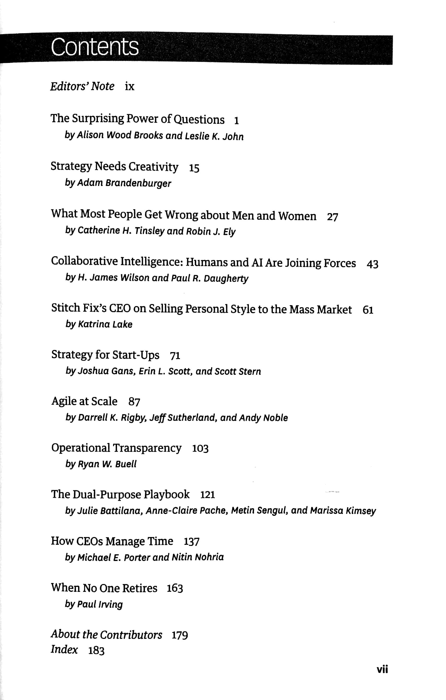 This collection of articles includes "The Surprising Power of Questions," by Alison Wood Brooks and Leslie K. John; "Strategy Needs Creativity," by Adam Brandenburger; "What Most People Get Wrong about Men and Women," by Catherine H. Tinsley and Robin J. Ely; "Collaborative Intelligence: Humans and AI Are Joining Forces," by H. James Wilson and Paul R. Daugherty; "Stitch Fix's CEO on Selling Personal Style to the Mass Market," by Katrina Lake; "Strategy for Start-Ups," by Joshua Gans, Erin L. Scott, and Scott Stern; "Agile at Scale," by Darrell K. Rigby, Jeff Sutherland, and Andy Noble; "Operational Transparency," by Ryan W. Buell; "The Dual-Purpose Playbook," by Julie Battilana, Anne-Claire Pache, Metin Sengul, and Marissa Kimsey; "How CEOs Manage Time," by Michael E. Porter and Nitin Nohria; and "When No One Retires," by Paul Irving.