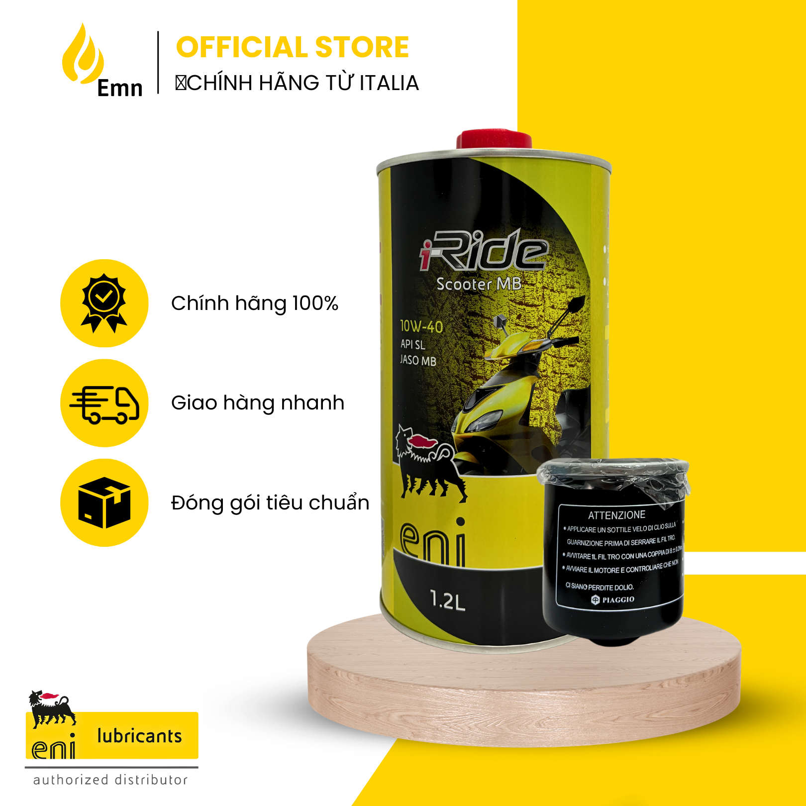 Mua tại Tiktok- ENI I-RIDE SCOOTER MB 10W-40 là loại dầu nhớt chất lượng cao với bao bì 1.2L được đóng gói chuyên dụng cho xe Vespa/Piaggio Tính chất . Cấp nhớt: JASO MB | API SL . Phân loại: Nhớt tổng hợp (Synthetic Technology) . Dung tích: 1.2L Đặc tính . Các thành phần được cẩn thận lựa chọn để góp phần tiết kiệm nhiên liệu hơn trong các ứng dụng hộp số tự động (xe tay ga). . Khởi động máy nhanh, mà không mất nhiều thời gian chờ . Đặc tính mát máy và chạy êm mượt, tiết kiệm nhiên liệu . Thay nhớt sau 2,000-3,000km hành trình Ứng dụng . Khuyến nghị sử dụng cho xe Vespa/Piaggio *LỌC NHỚT: TÍNH CHẤT Lọc dầu (lọc nhớt) xe Vespa – Piaggio giúp lọc cặn bẩn khi xe hoạt động, giúp nhớt sạch, bôi trơn tốt nhất. Nếu lọc dầu bị hỏng, một lượng nhớt động cơ sẽ không được lọc, chất bẩn sẽ đi vào hệ thống bôi trơn độn cơ gây ra hiện tượng quá nhiệt, thậm chí hư hỏng. – Vì thế cần phải thay lọc dầu định kỳ theo khuyến cáo của nhà sản xuất. ĐẶC TÍNH Sản phẩm cam kết chính hãng Piaggio 100%.