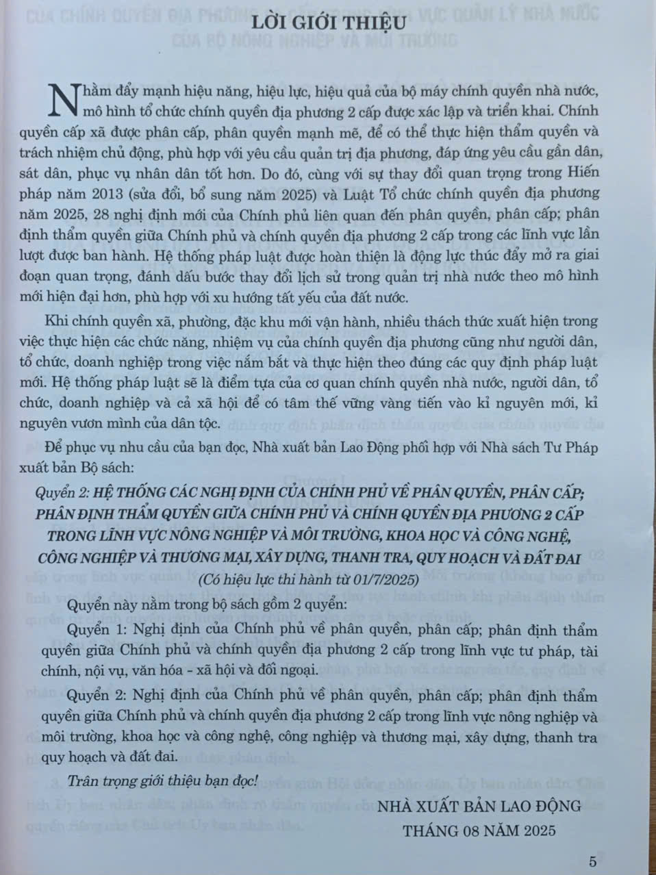 Quyển 2: Hệ thống các nghị định của Chính phủ về phân quyền, phân cấp; phân định thẩm quyền Chính phủ và chính quyền địa phương 2 cấp trong lĩnh vực nông nghiệp và môi trường, khoa học và công nghệ, công nghiệp và thương mại, xây dựng, thanh tra, quy hoạch và đất đai