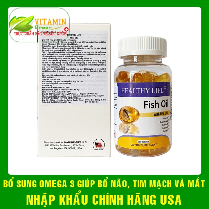 Mua tại TiktokViên Uống Dầu Cá Bổ Sung Omega 3 – Healthy Life Fish Oil là thực phẩm bảo vệ sức khoẻ được được sản xuất tại Amf Pharma, LLC, Hoa Kỳ. Sản phẩm được bào chế dưới dạng viên, uống trực tiếp, thích hợp cho người cần bổ sung omega 3. Healthy Life Fish Oil chứa EPA, DHA tốt cho não, mắt và tim mạch, tăng cường sức khỏe. CÔNG DỤNG CỦA Healthy Life Fish Oil: