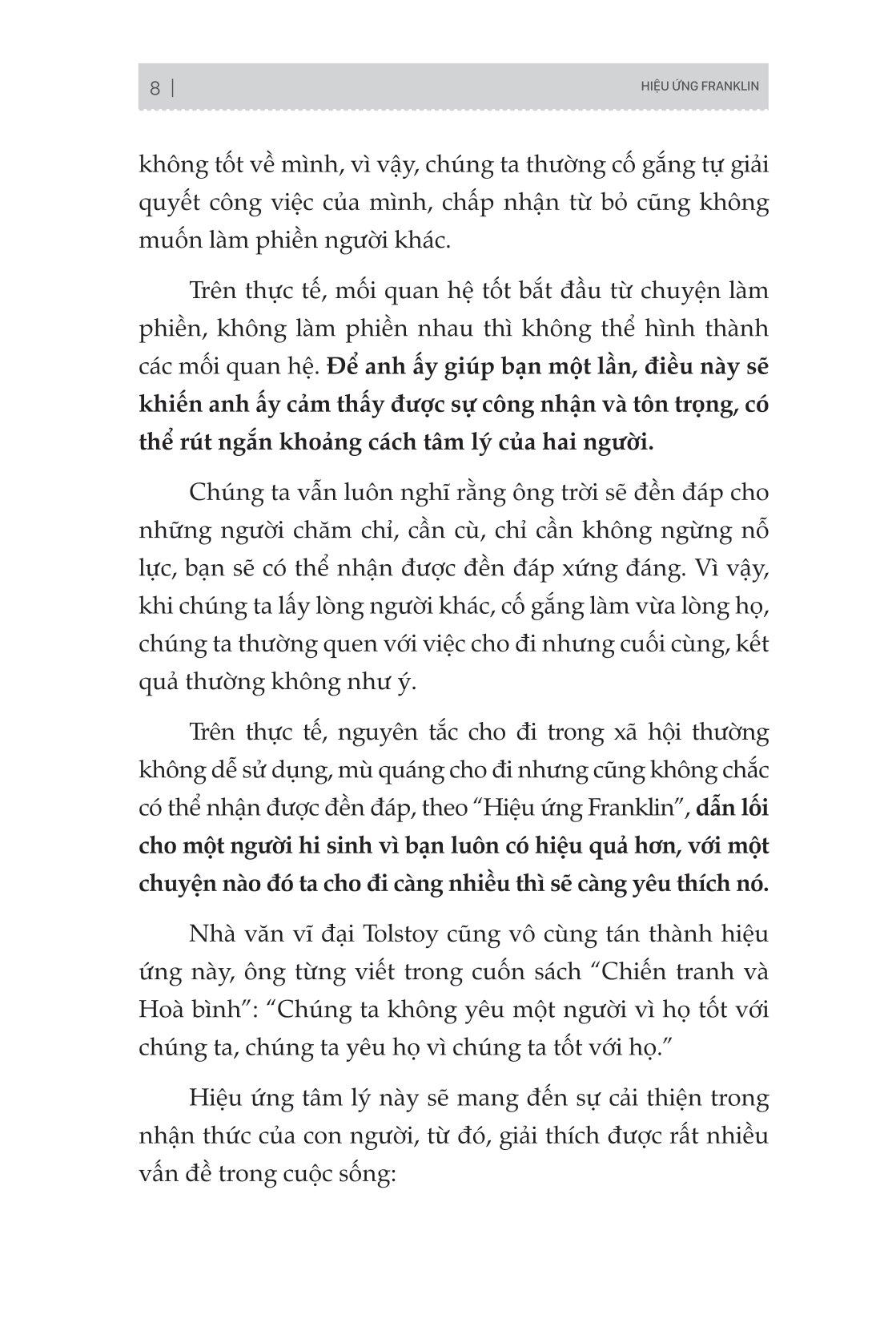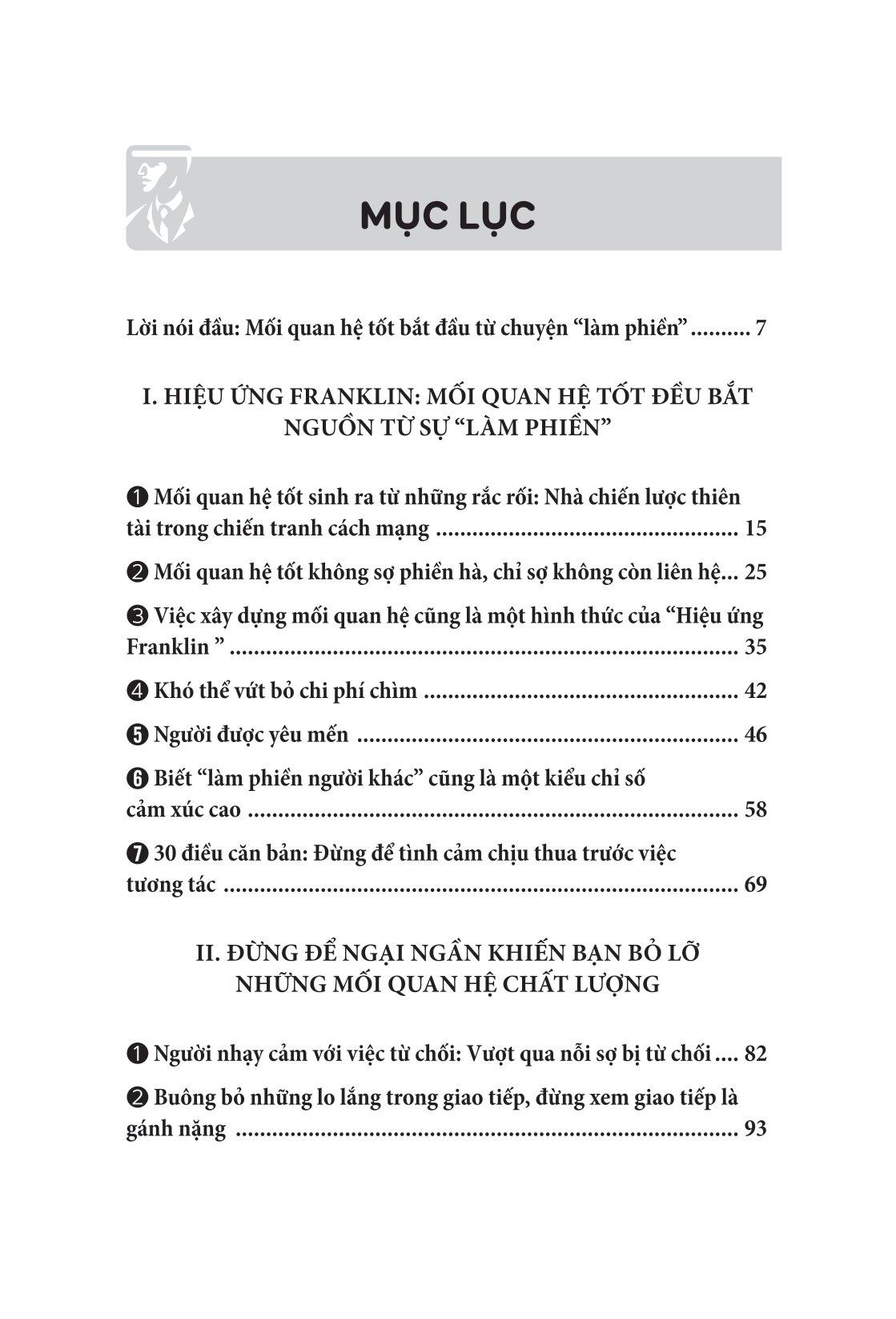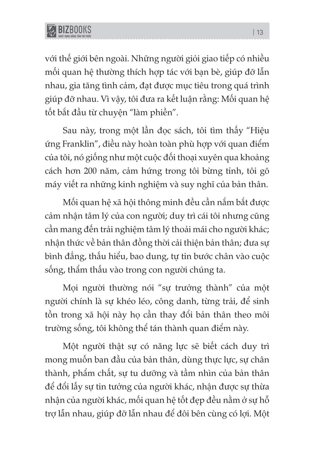 “Hiệu ứng Franklin - Mối quan hệ tốt bắt nguồn từ sự làm phiền” sẽ giúp bạn bước chân vào cuộc sống thực tế thông qua kiến thức tâm lý học phổ thông, dễ hiểu, là một sổ tay về giao tiếp xã hội mà bất kì ai cũng có thể đọc hiểu. Rồi bạn sẽ nhận ra, ngại ngùng khi làm phiền người khác không phải một đức tính tốt, lẩn trốn trong thế giới của bản thân đánh mất liên hệ với thế giới bên ngoài. Mối quan hệ tốt bắt đầu từ chuyện “làm phiền”. Sống ở đời, không thể lúc nào cũng đơn phương độc mã. Biết cách làm phiền người khác là một biểu hiện của EQ cao, cũng là một hình thức khiến đôi bên cảm nhận được sự ấm áp, cảm nhận được giá trị của nhau. Mong tất cả chúng ta đều học được cách mở lòng và nhờ vả người khác một cách đúng đắn.