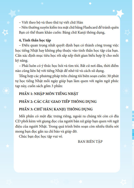 Tổng hợp các phương pháp trên chúng tôi biên soạn cuốn: 30 Phút Tự Học Tiếng Nhật Mỗi Ngày giúp bạn làm quen với ngôn ngữ phức tạp này, cuốn sách gồm 3 phần: