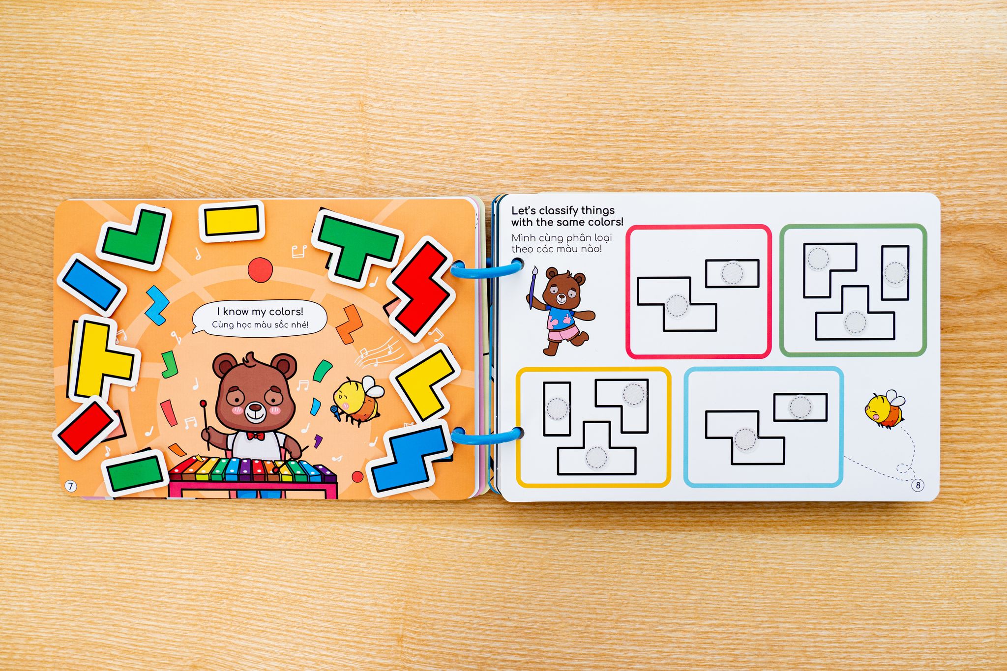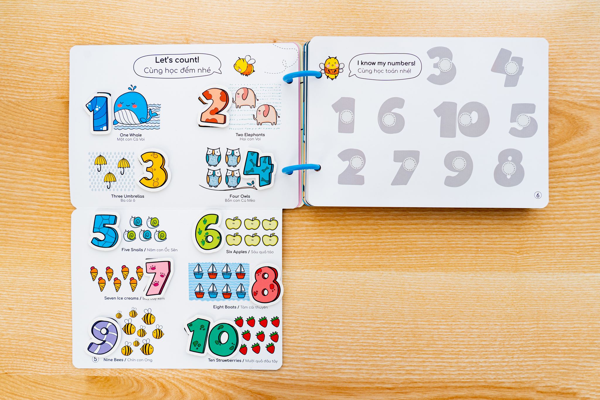 - Song ngữ Anh Việt - Bé sẽ tiếp thu nhanh hơn thông qua việc nhìn mặt chữ và hình ảnh, các hành động bóc từ trang này, dán vào trang kia