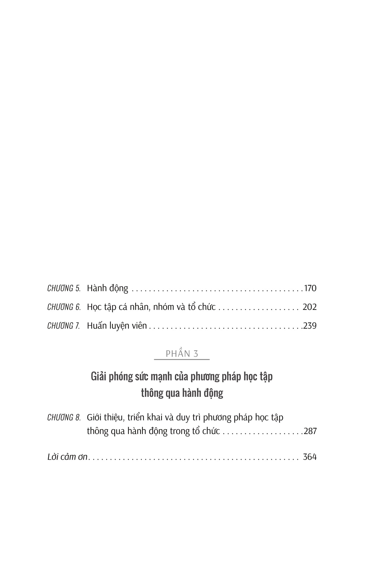 Chương 5 đề cập đến việc giải quyết vấn đề, lập khung mục tiêu và phát triển chiến lược. Chương 6 sẽ điểm qua kết quả mà nhóm, cá nhân và tổ chức có thể đạt được từ quá trình học tập thông qua hành động.
