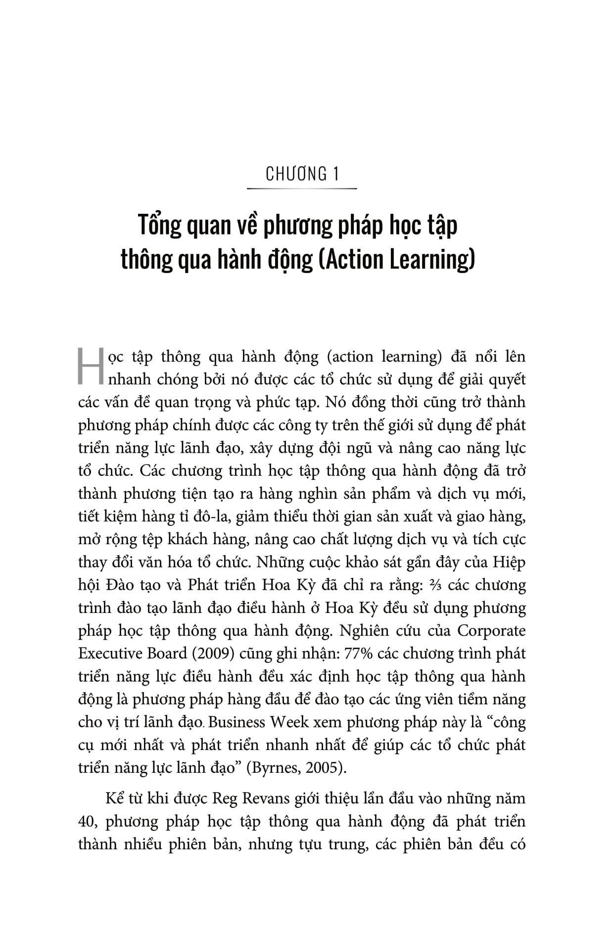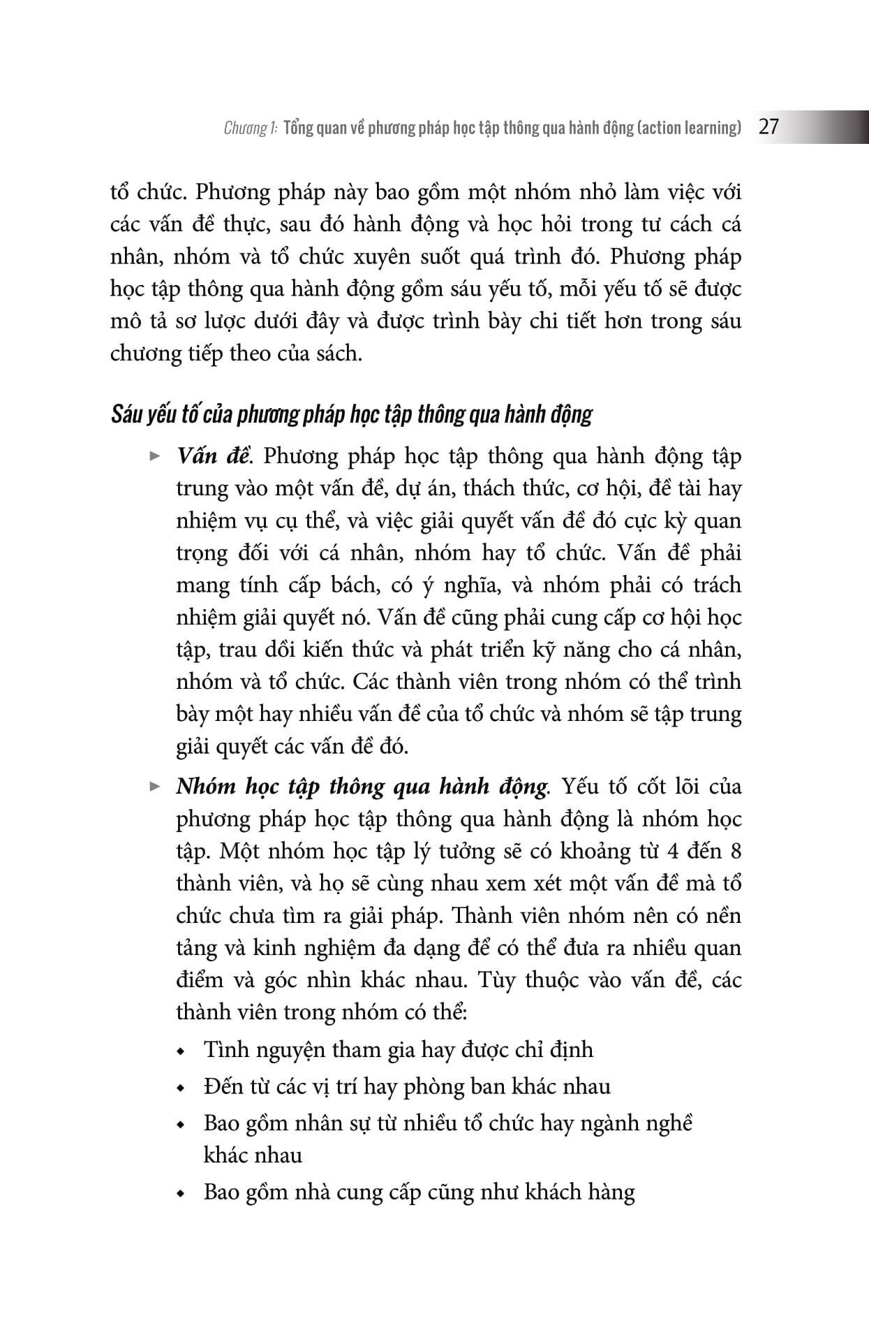 Chương 1 sẽ cung cấp cái nhìn tổng quan về phương pháp học tập thông qua hành động – gồm sáu yếu tố cơ bản và hai nguyên tắc nền tảng chính. Chương này sẽ tóm lược năm thách thức lớn nhất mà các tổ chức có thể gặp phải trong môi trường làm việc ngày nay và giới thiệu cách các tổ chức có thể sử dụng phương pháp này để đối phó hiệu quả với những thách thức đó.