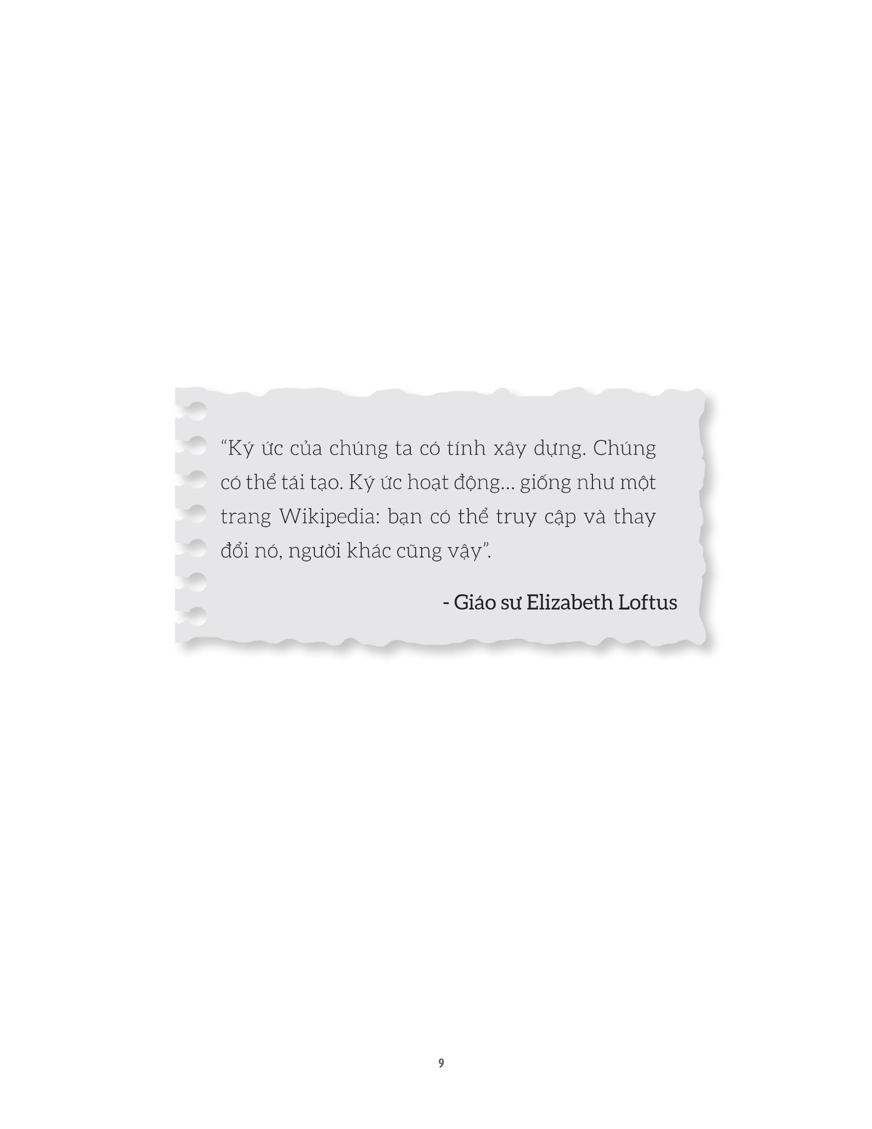 - Bạn nghĩ rằng mọi ký ức của m.ình đều hoàn toàn chính xác? Những lỗi trong quá trình ghi nhớ của chúng ta diễn ra rất phổ biến. Mọi người thường nghĩ rằng bộ não của chúng ta ghi nhớ như một thứ giống như một máy ghi hình - ghi lại và lưu trữ mọi thứ xảy ra với độ chính xác tuyệt đối . Trong thực tế, rất dễ mắc các lỗi trong việc ghi nhớ. Nhiều người có thể vô cùng tự tin rằng trí nhớ của họ chính xác, nhưng thực tế đáng buồn là, trí nhớ không phải bản ghi chép quá khứ chính xác và hoàn hảo như chúng ta vẫn tưởng. Ký ức liên tục biến mất. Ta bước vào phòng và ngay lập tức quên mất m.ình vào đây để làm gì, hoặc ta đột nhiên không thể nhớ ra tên của một người mà m.ình đã gặp nhiều lần trước đó. Vậy hãy thử tưởng tượng, những hậu quả nghiêm trọng nào có thể bị kéo theo, nếu như bộ nhớ đầy thiếu sót của ta không những quên, mà còn có nguy cơ bóp méo thông tin và thêu dệt nên một ký ức hoàn toàn mới - ngay cả khi chuyện đó chưa từng xảy ra? Hội chứng ký ức giả là cuốn sách tổng hợp những nghiên cứu mới nhất về não bộ và trí nhớ: cơ chế ghi nhớ của não bộ, các yếu tố hình thành nên những ký ức không có thật và một số nguyên tắc để cải thiện trí nhớ. Trong cuốn Hội chứng ký ức giả, nhà tâm lý học pháp y, đồng thời là chuyên gia về trí nhớ, Tiến sĩ Julia Shaw đ.ã sử dụng những nghiên cứu mới nhất cho thấy cách bộ não của chúng ta bóp méo ký ức đúng đắn và tạo ra những ký ức về sự kiện không có thực. Cuốn sách đưa ra các dẫn chứng cho người đọc hiểu rằng, ký ức giả không chỉ ảnh hưởng tới chính bản thân người sở hữu ký ức đó, mà còn ảnh hưởng tới xã hội như thế nào: Ký ức giả có thể khiến chúng ta tự tin thái quá vào khả năng ghi nhớ của chính m.ình, khiến cảnh sát bỏ tù không ít người vô tội, thậm chí có thể khiến một người nổi tiếng tiêu tan sự nghiệ Không chỉ có vậy, cuốn sách còn tiết lộ cách để cải thiện trí nhớ thông qua việc thừa nhận ký ức có nguy cơ bị sai sót. Từ đó, người đọc không chỉ sở hữu những kiến thức về khoa học trí nhớ, mà còn biết thêm nhiều phương pháp giúp tăng cường khả năng lưu giữ thông tin chính xác và hiệu quả. Lôi cuốn và đầy bất ngờ, Hội chứng ký ức giả chính là một người bạn đồng hành trên con đường khám phá bản thân chúng ta dựa trên cơ sở khoa học về trí nhớ. Cuốn sách này sẽ giúp chúng ta hiểu hơn về cách ghi nhớ của não bộ, về tính đúng đắn của những ký ức mà ta sở hữu, khiến bạn phải đặt câu hỏi rằng bạn thực sự hiểu bản thân m.ình đến mức nào. Về tác giả Tiến sĩ Julia Shaw là một giảng viên và nhà nghiên cứu kỳ cựu của Trường Luật và Khoa học Xã hội, Đại học London South Bank, đồng thời là một trong số ít chuyên gia trên thế giới thực hiện nghiên cứu về những sai sót trí nhớ phức tạp liên quan đến các sự kiện cảm xúc cá nhân - hay còn gọi là những “ký ức sống động nhưng hoàn toàn không có thật”. Tiến sĩ Shaw xuất bản nhiều bài viết khoa học trên các tạp chí học thuật quốc tế, xây dựng giáo trình, thường xuyên cộng tác với tạp chí khoa học nổi tiếng Scientific American, thỉnh giảng và tham gia thuyết trình tại các hội thảo trên khắp thế giới. Cô cũng giảng dạy các lớp ở bậc đại học và sau đại học, đồng thời đã thắng hai giải thưởng dạy học xuất sắc.