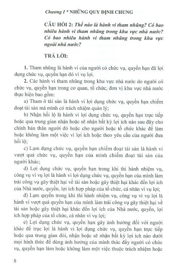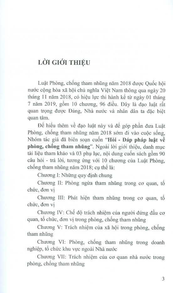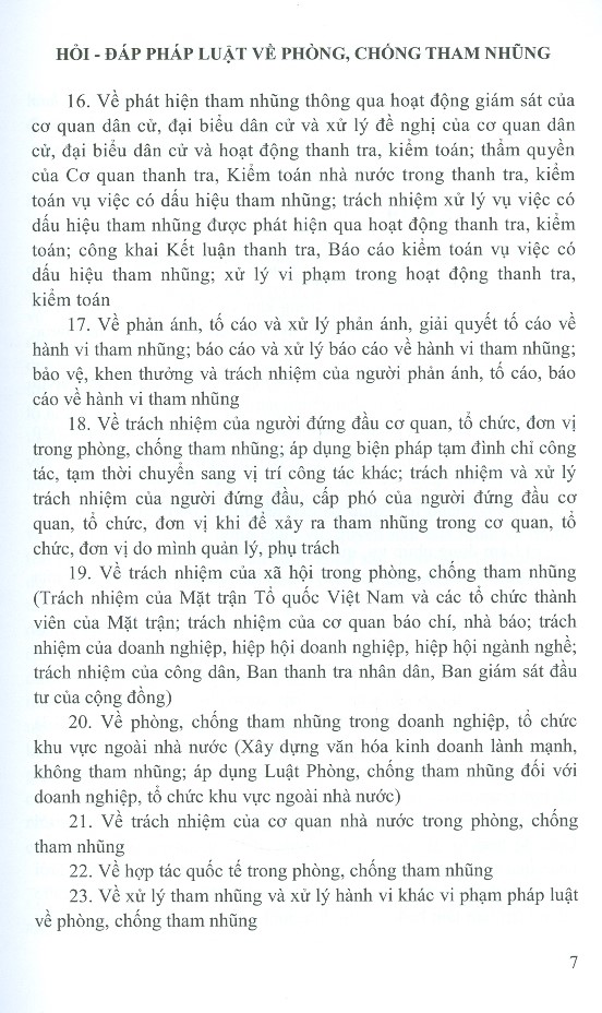 Mua tại TiktokGồm 90 câu hỏi - trả lời liên quan đến những vấn đề về phòng ngừa, phát hiện tham nhũng trong cơ quan, tổ chức, đơn vị; chế độ trách nhiệm của người đứng đầu cơ quan, tổ chức, đơn vị; trách nhiệm của xã hội, của cơ quan nhà nước trong phòng, chống tham nhũng ; hợp tác quốc tế về phòng, chống tham nhũng; xử lý tham nhũng và hành vi vi phạm pháp luật về phòng, chống tham nhũng; điều khoản thi hành.