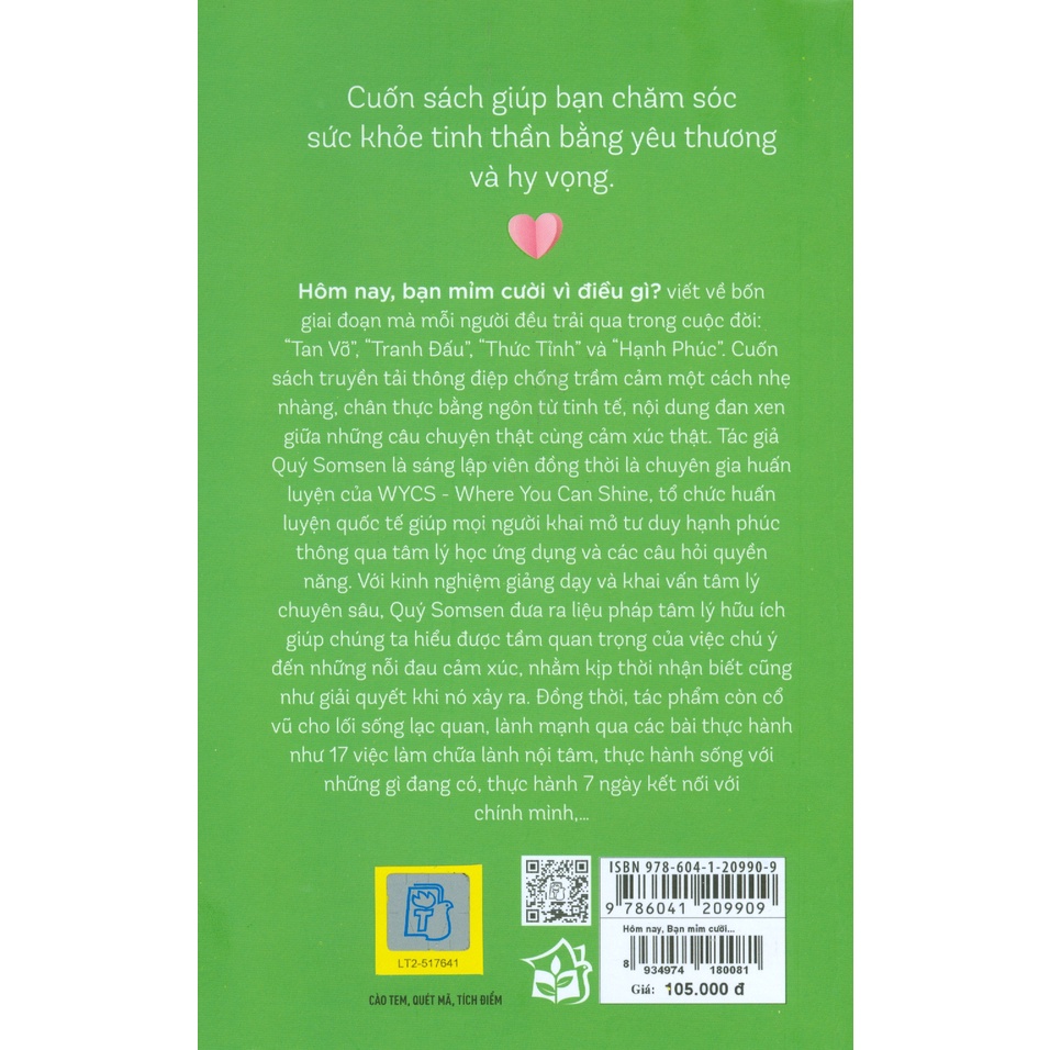 Một cuốn sách giúp bạn chăm sóc sức khỏe tinh thần bằng hy vọng và yêu thương. “Hôm nay, bạn mỉm cười vì điều gì?” gồm bốn chương là “Tan Vỡ”, “Tranh Đấu”, “Thức Tỉnh” và “Hạnh Phúc”, theo tác giả đó cũng chính là bốn giai đoạn của cuộc đời mà chúng ta đều trải qua. Tác phẩm truyền tải thông điệp chống trầm cảm một cách nhẹ nhàng, chân thực bằng ngôn từ tinh tế, nội dung đan xen giữa những câu chuyện thật cùng cảm xúc thật. Tác giả Quý Somsen là sáng lập viên đồng thời là chuyên gia huấn luyện của WYCS - Where You Can Shine, tổ chức huấn luyện quốc tế giúp mọi người khai mở tư duy hạnh phúc thông qua tâm lý học ứng dụng và các câu hỏi quyền năng. Với kinh nghiệm giảng dạy và tư vấn tâm lý chuyên sâu của mình, Quý Somsen đưa ra liệu pháp tâm lý hữu ích giúp chúng ta hiểu được tầm quan trọng của việc chú ý đến những nỗi đau cảm xúc, nhằm kịp thời nhận biết cũng như giải quyết khi nó xảy ra. Đồng thời, tác phẩm còn cổ vũ cho lối sống lạc quan, lành mạnh bằng cách thực hành chánh niệm. Các bài thực hành rất đơn giản như: 17 việc làm chữa lành nội tâm, thực hành sống với những gì đang có, thực hành 7 ngày kết nối với chính mình,… chính là những cách mà tác giả tự mình thực hiện để vượt qua giai đoạn khó khăn trong cuộc sống, để đẩy lùi cảm xúc tiêu cực, duy trì suy nghĩ tích cực, tập trung vào hiện tại, và hòa mình với thiên nhiên nhiều hơn.