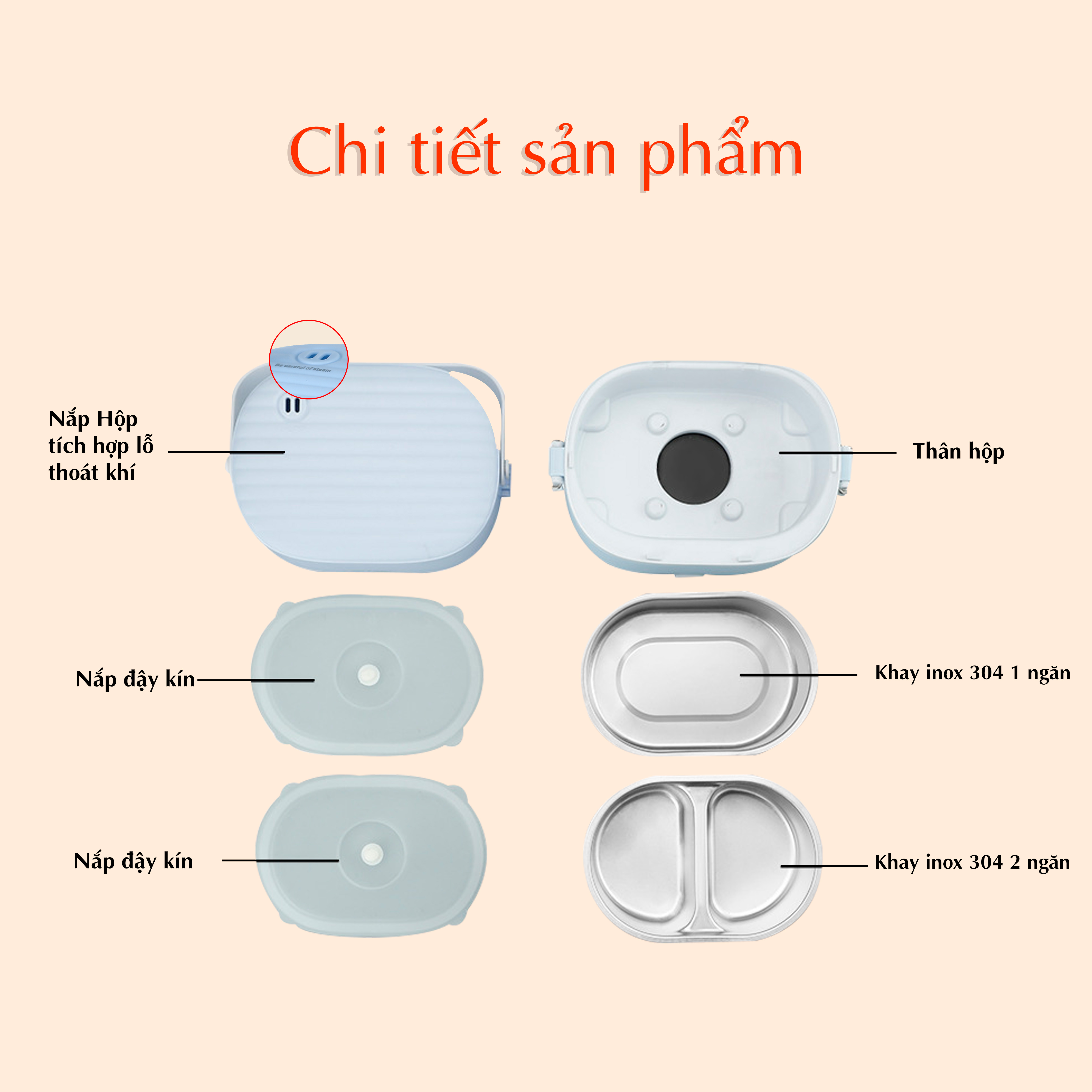 MÔ TẢ SẢN PHẨM Gồm 4 ngăn: Ngăn đựng cơm 0,6L: đựng được 3 chén cơm 2 Ngăn chứa thức ăn 0,3L, Ngăn đựng canh 0,27L Vỏ ngoài của hộp đựng cơm được thiết kế