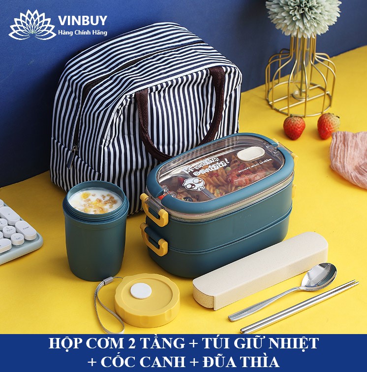 Hộp đựng cơm giữ nhiệt nhiều tầng Inox 304 cao cấp kèm túi giữ nhiệt và bộ thìa đũa
