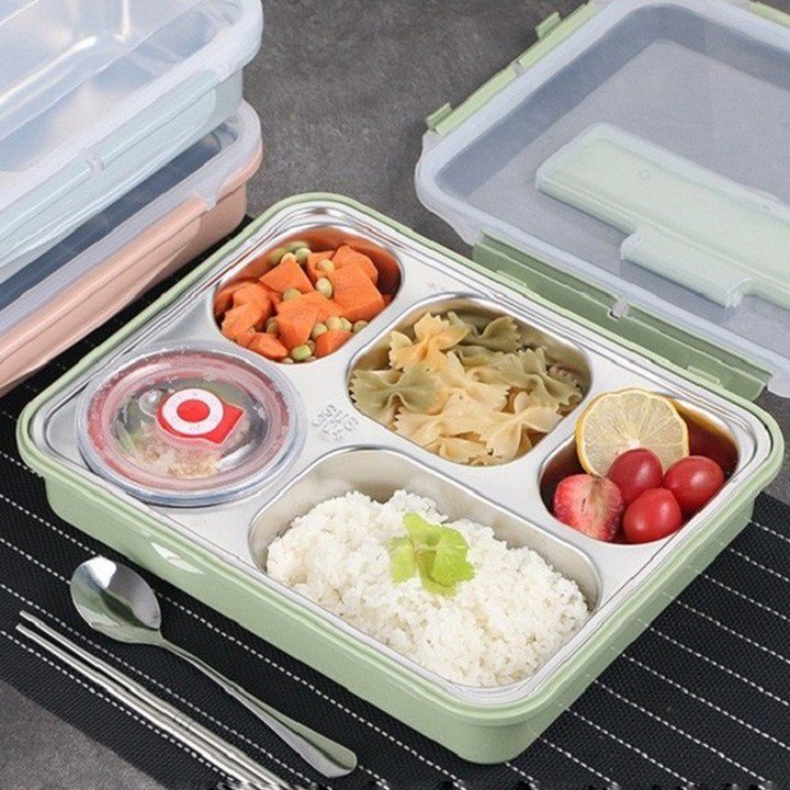 Hộp Cơm Văn Phòng 5 Ngăn Inox 304 Giữ Nhiệt Chống Tràn Có Giá Điện Thoại Tặng Thìa Đũa Cao Cấp- Hàng Chính Hãng MINIIN Bộ sản phẩm bao gồm 1hộp 5 ngăn inox 340,