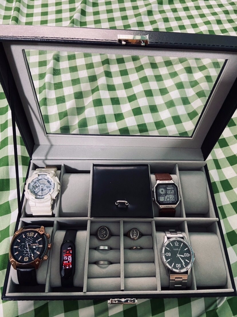 Bạn có khoảng 6-8 chiếc đồng hồ và phụ kiện trang sức như nhẫn, vòng ùng với đó bạn thích hộp có mặt kính để nhìn thấy phụ kiện bên trong hộp và hộp có