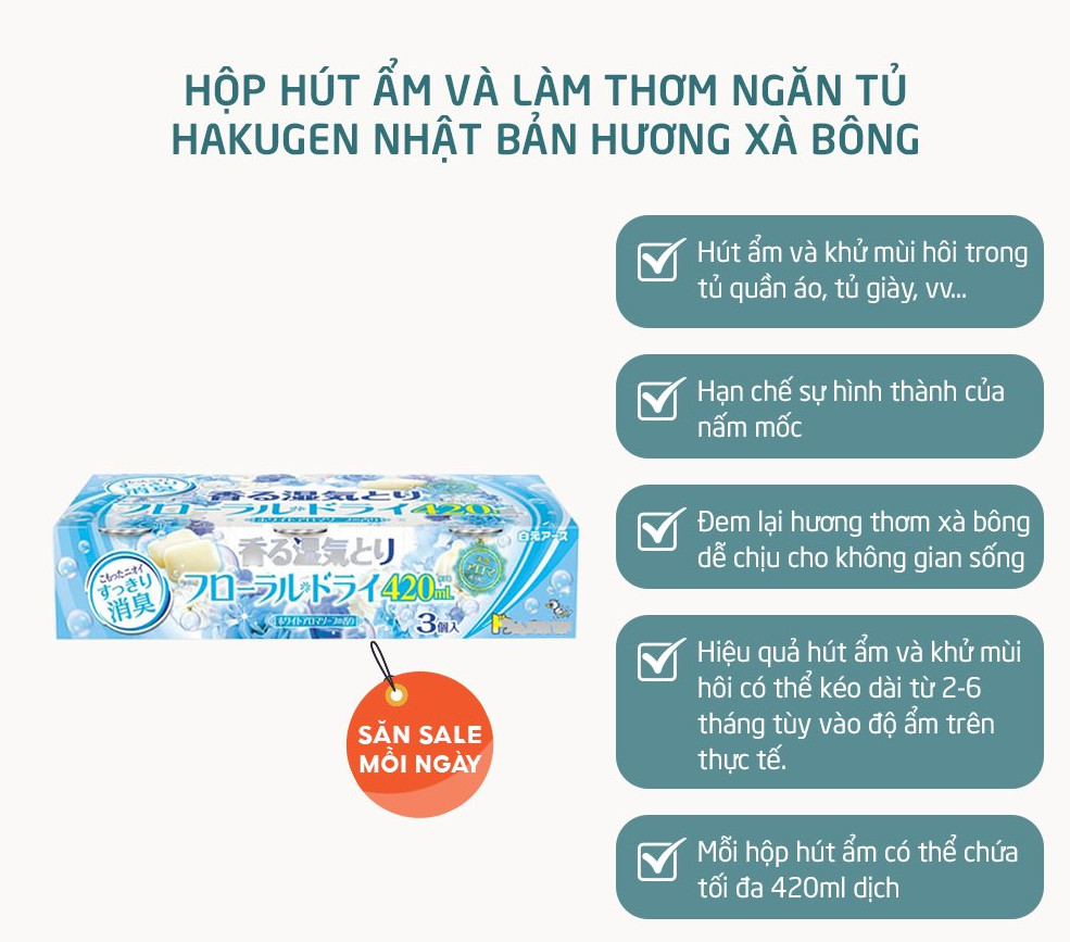 Hộp Hút Ẩm Và Làm Thơm Ngăn Tủ (Hương Hoa Thiên Nhiên) Hakugen Earth giúp hút ẩm và khử mùi hôi trong tủ quần áo, tủ giày, từ đó hạn chế sự hình thành của nấm mốc và mang đến hương hoa thơm dịu nhẹ. Hiệu quả hút ẩm và khử mùi hôi có thể kéo dài từ 2-6 tháng tùy vào độ ẩm trên thực tế. Mỗi hộp hút ẩm chia thành 3 hộp nhỏ, mỗi hộp nhỏ có thể chứa tối đa 420ml dịch. Tối đa sau 1 năm sử dụng phải thay mới sản phẩm.