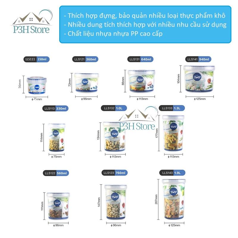 Hộp bảo quản thực phẩm nắp vặn Lock&Lock Twist LLS1 Dung tích và kích thước: Dung tích 150ml , Kích thước: Đường kính 75mm x 56mm Dung tích 330ml , Kích thước: Đường kính 75mm
