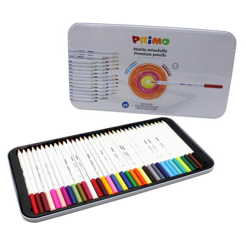 Hộp Thiếc Gồm 36 Bút Chì Màu Minabella PRIMO 5247MINAB36 Bút chì màu chất lượng cao có hàm lượng sắc tố cao. Màu sắc phong phú. Có thể tô chồng lên nhau hoặc trộn màu