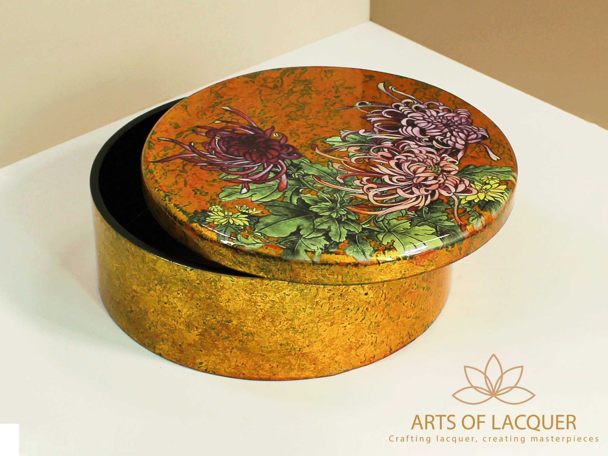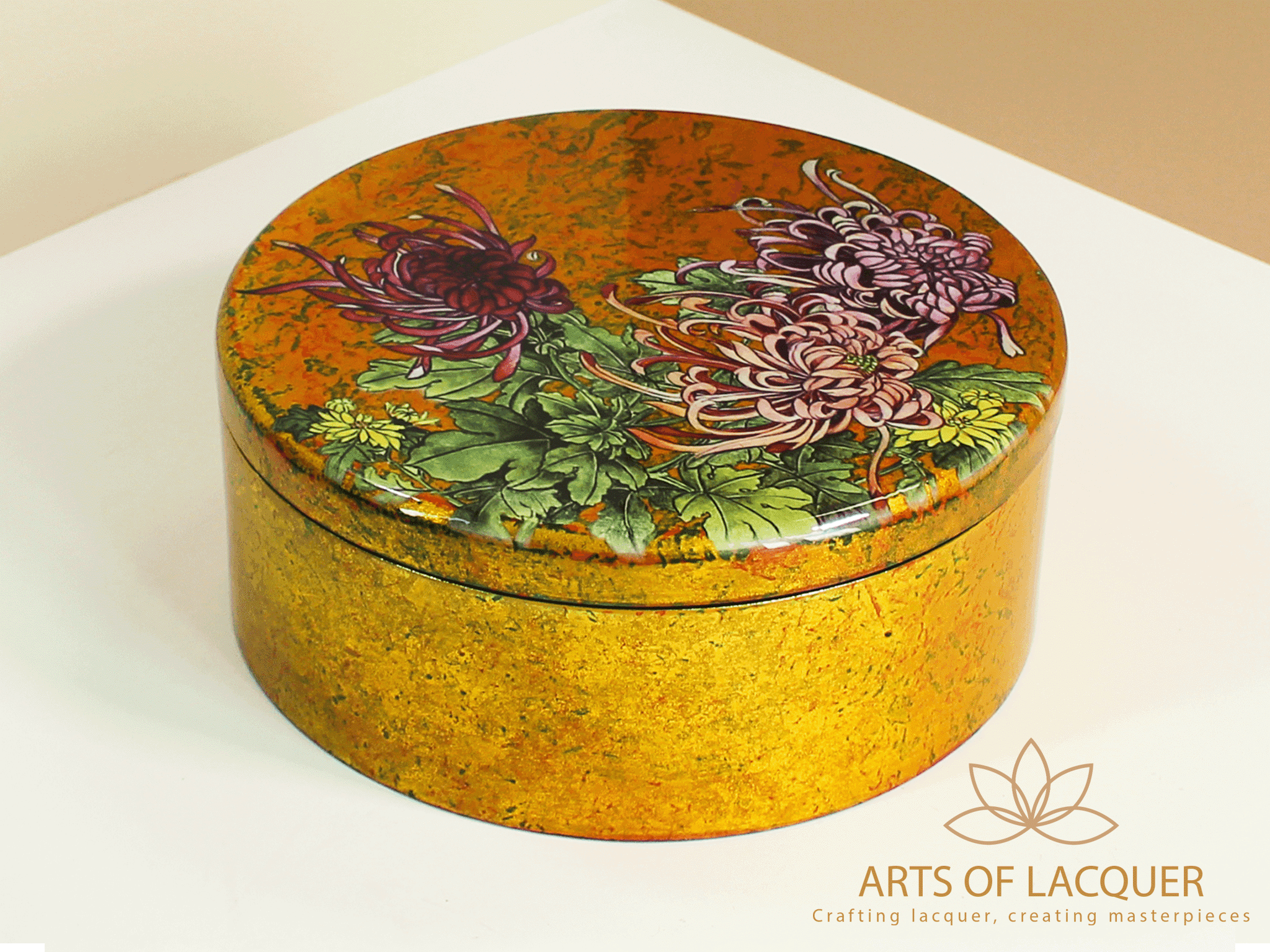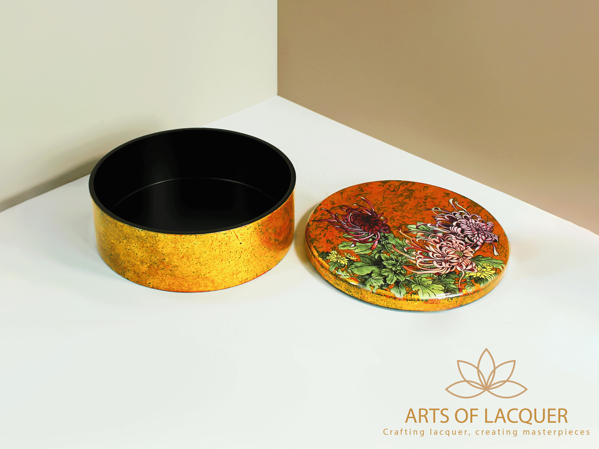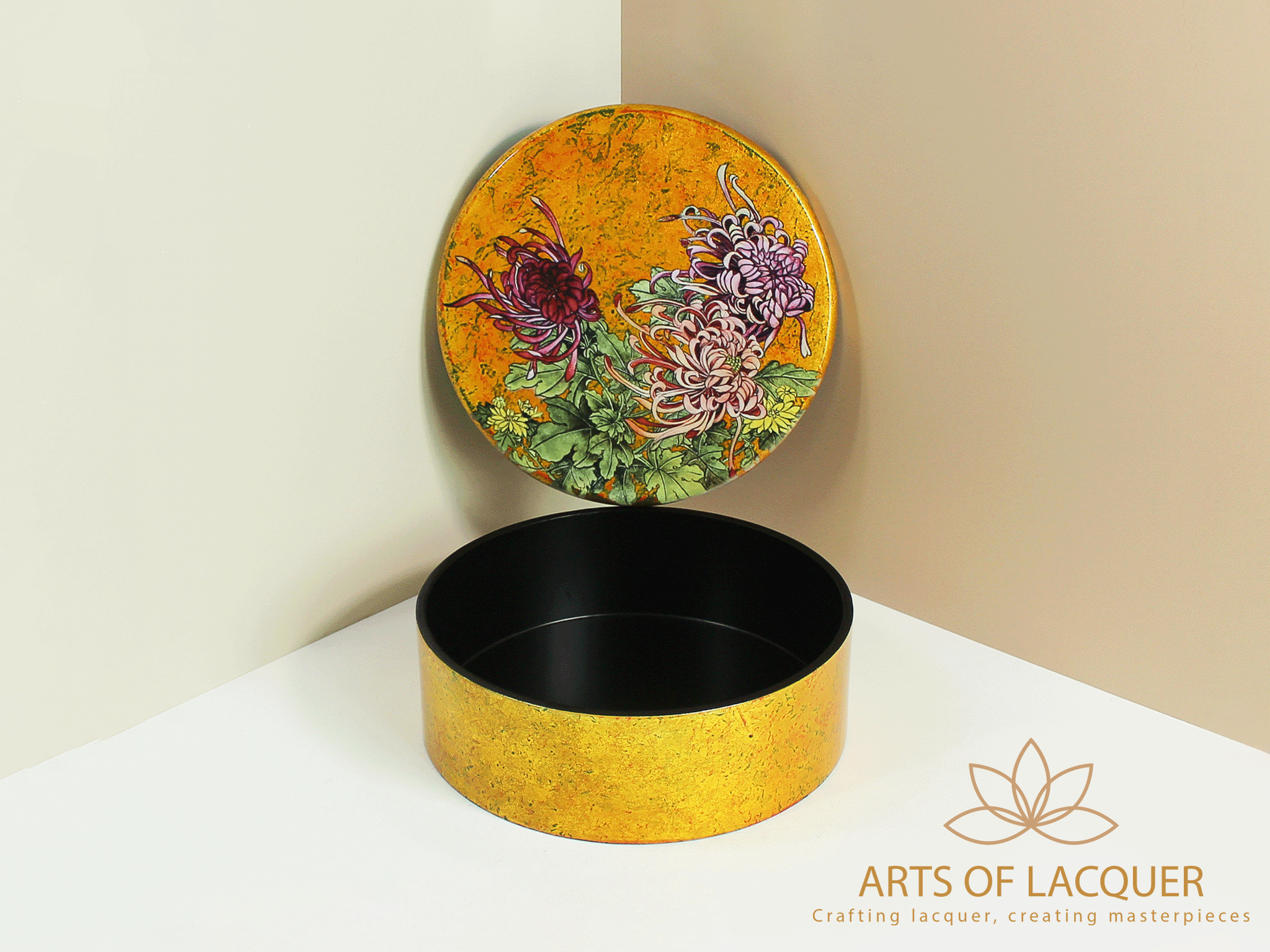 Hộp Tròn Sơn Mài Cao Cấp Họa Tiết Hoa Cúc Vàng | Arst Of Lacquer
