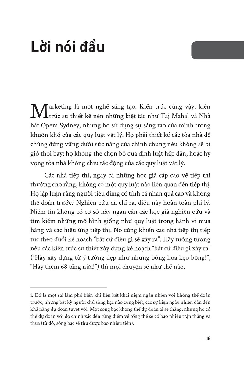 Cuốn sách đưa ra câu trả lời xác đáng cho những vấn đề muôn thuở của lĩnh vực tiếp thị như: Làm thế nào để phát triển một thương hiệu? Làm sao để quảng cáo một cách hiệu quả? Áp dụng các chương trình giảm giá có thực sự có tác dụng? Đây là cuốn sách đầu tiên trình bày các quy luật tiếp thị trong bối cảnh cụ thể, đồng thời khám phá ý nghĩa cũng như ứng dụng của chúng. Với những nghiên cứu được thực hiện trong hàng thập kỷ, cuốn sách là một cẩm nang hoàn hảo được viết cho các chuyên gia tiếp thị nhằm phát triển thương hiệu của họ.