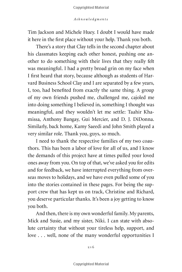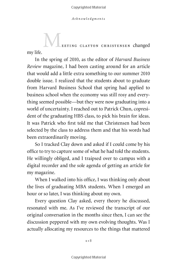 In this groundbreaking book, Christensen puts forth a series of questions: How can I be sure that I'll find satisfaction in my career? How can I be sure that my personal relationships become enduring sources of happiness? How can I avoid compromising my integrity-and stay out of jail? Using lessons from some of the world's greatest businesses, he provides incredible insights into these challenging questions.