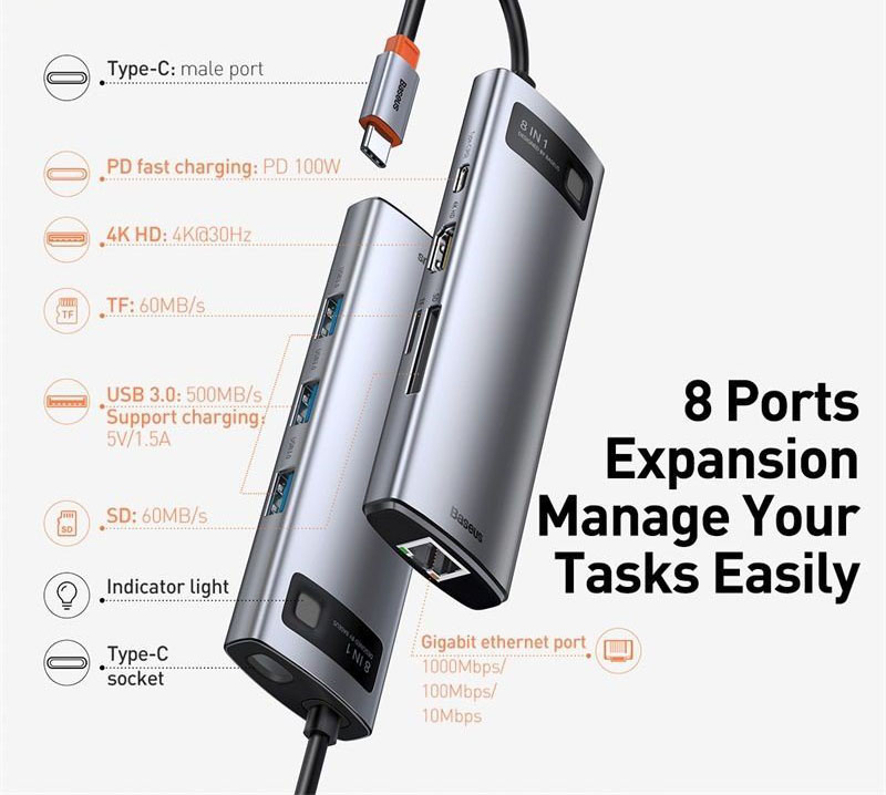 1. Input: USB Type C 2. Output: 2*USB 3.0 A Female, 1*USB 2.0,1*HDMI,1*RJ45 Gigabit, 1*TF slot, 1*SD slot,1*PD 3. USB 3.0 standard, speed up to 5Gbps, compatible with USB 2.0/1.1 4. HDMI resolution up to