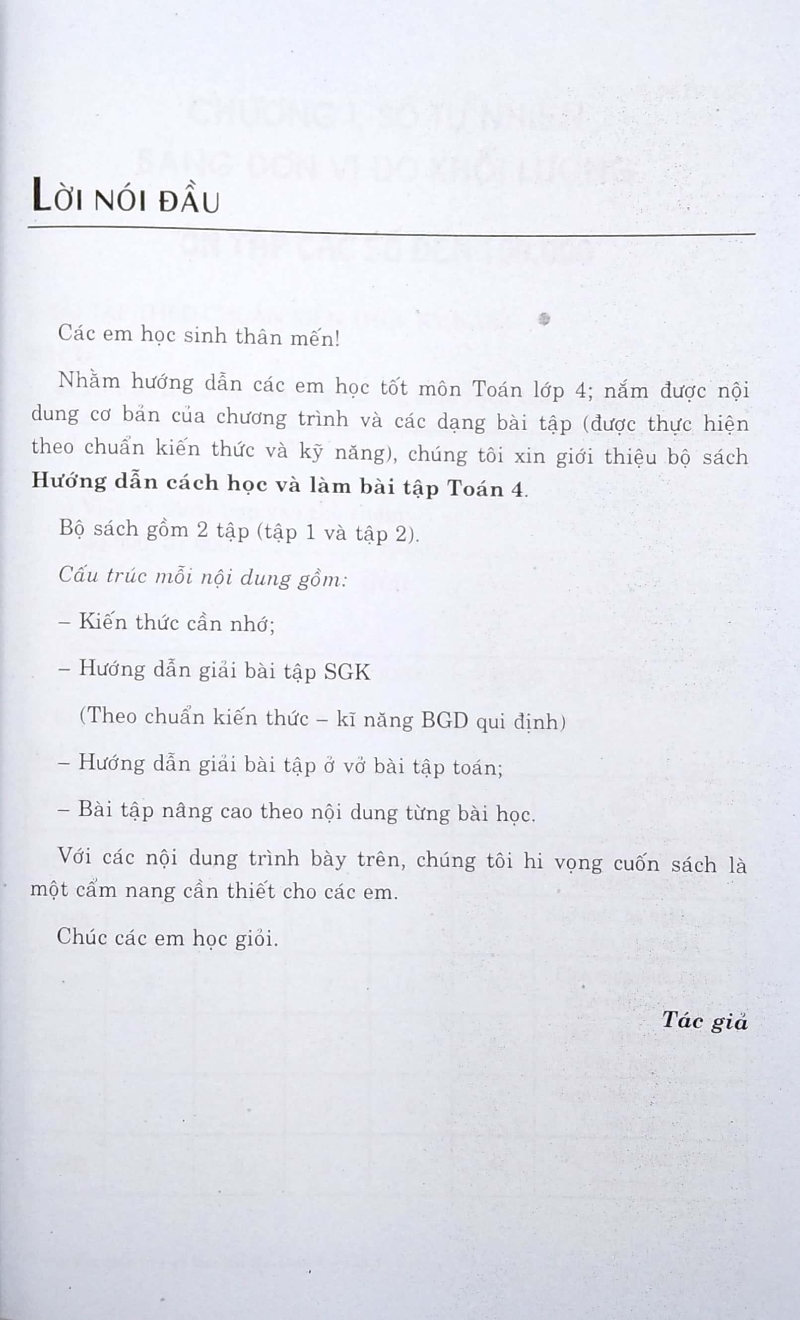 Mua tại TiktokHướng Dẫn Cách Học Và Làm Bài Tập Toán 4 - Tập 1 Các em học sinh thân mến! Nhằm hướng dẫn các em học tốt môn Toán lớp 4; nắm được nội dung cơ bản của chương trình và các dạng bài tập (được thực hiện theo chuẩn kiến thức và kỹ năng), chúng tôi xin giới thiệu bộ sách Hướng dẫn cách học và làm bài tập Toán 4.. Bộ sách gồm 2 tập (tập 1 và tập 2). Cấu trúc mỗi nội dung gồm: