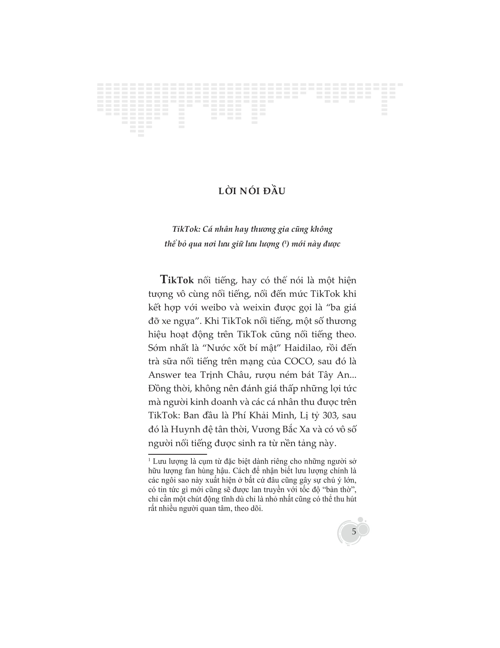 Xét từ góc độ thay đổi và sức mua của fan, chất lượng lưu lượng của TikTok là cao nhất và cũng phù hợp với hoạt động quảng cáo nhất. Hiện nay, lợi tức của TikTok đang ở giai đoạn tăng trong hình chữ U ngược, nếu muốn thu được nhiều lợi tức thì phải nắm bắt được. Vậy sử dụng TikTok như thế nào mới thu hút được nhiều lượng truy cập hơn? “Hướng dẫn kiếm tiền trên TikTok” sẽ giải quyết vấn đề đó. Cuốn sách này đề cập đến mọi khía cạnh việc làm TikTok bao gồm xác định vị trí, content, video, thu hút fan, phát triển, ma trận, lặp lại và kiếm tiền, với những ví dụ đầy đủ, bắt đầu từ khái niệm TikTok đến kỹ xảo thao tác thực tế.