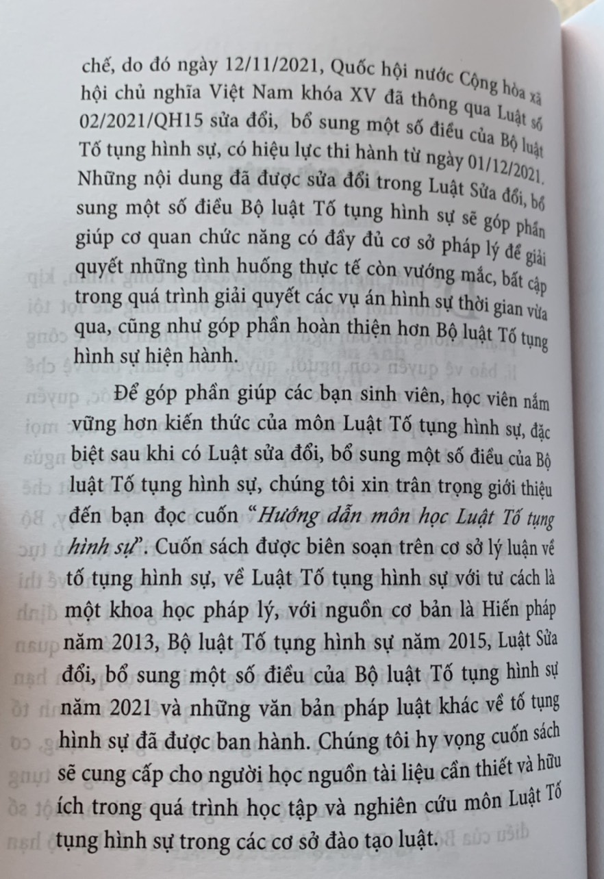 Để góp phần giúp các bạn sinh viên, học viên nắm họn vững hơn kiến thức của môn Luật Tố tụng hình sự, đặc sống, biệt sau khi có Luật sửa đổi, bổ sung một số điều của Bộ ad luật Tố tụng hình sự, chúng tôi xin trân trọng giới thiệu Đã đến bạn đọc cuốn “Hướng dẫn môn học Luật Tố tụng ng hình sự”. Cuốn sách được biên soạn trên cơ sở lý luận về irly 3 tố tụng hình sự, về Luật Tố tụng hình sự với tư cách là rin là một khoa học pháp lý, với nguồn cơ bản là Hiến pháp năm 2013, Bộ luật Tố tụng hình sự năm 2015, Luật Sửa hạn đổi, bổ sung một số điều của Bộ luật Tố tụng hình sự of si năm 2021 và những văn bản pháp luật khác về tố tụng 03 hình sự đã được ban hành. Chúng tôi hy vọng cuốn sách ghi sẽ cung cấp cho người học nguồn tài liệu cần thiết và hữu de lộ ích trong quá trình học tập và nghiên cứu môn Luật Tổ Bạn tụng hình sự trong các cơ sở đào tạo luật