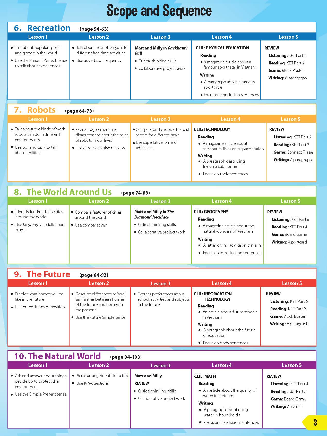 - Bám sát khung chương trình của Bộ Giáo dục và Đào tạo. Nội dung được biên soạn và thiết kế phù hợp với học sinh Việt Nam, lấy yếu tố văn hóa Việt Nam làm nền tảng xây dựng.
