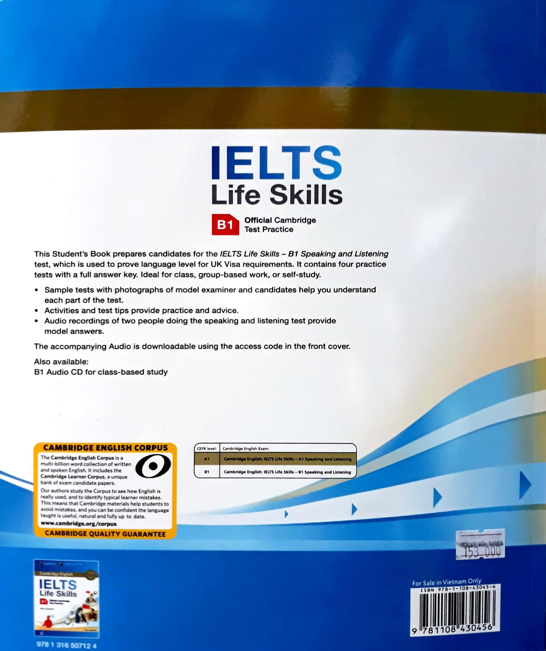 Mua tại TiktokOfficial preparation for the 'IELTS Life Skills' Speaking and Listening exam. This Student's Book prepares candidates for the IELTS Life Skills - B1 Speaking and Listening exam which is used to prove language level for UK Visa requirements. It includes four practice tests for the exam with a full answer key. There is an introduction to the exam with information about what to expect and guidelines for teachers on how to assess students. There are model Speaking answers, practice exercises and exam tips to support candidates. The accompanying Audio is downloadable using an access code in the book. Audio CDs are also available separately for class use .