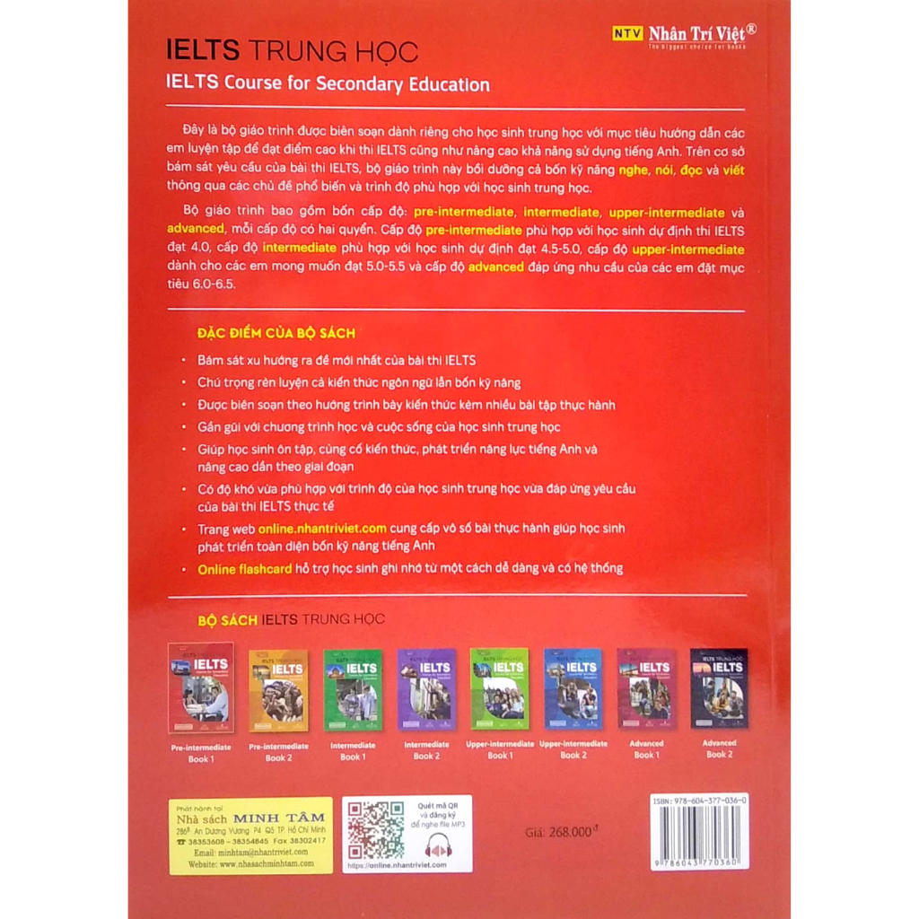 Đây là bộ giáo trình được biên soạn dành riêng cho học sinh trung học với mục tiêu hướng dẫn các em luyện tập để đạt điểm cao khi thi IELTS cũng như nâng cao khả năng sử dụng tiếng Anh. Trên cơ sở bám sát yêu cầu của bài thi IELTS, bộ giáo trình này bồi dưỡng cả bốn kỹ năng nghe, nói, đọc và viết thông qua các chủ đề phổ biến và trình độ phù hợp với học sinh trung học.