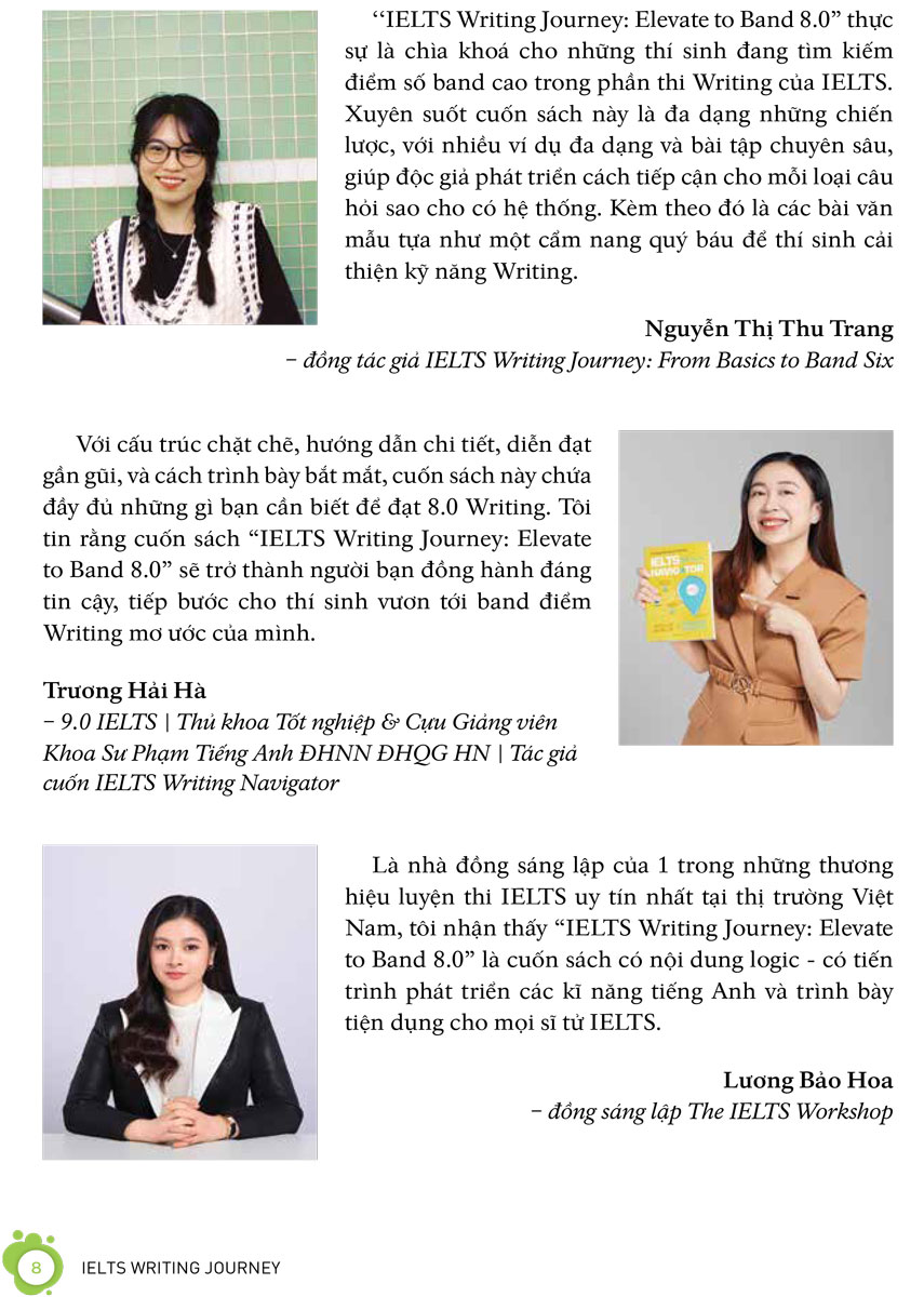 “Với cấu trúc chặt chẽ, hướng dẫn chi tiết, diễn đạt gần gũi, và cách trình bày bắt mắt, cuốn sách này chứa đầy đủ những gì bạn cần biết để đạt 8.0 Writing. Tôi tin rằng cuốn sách IELTS Writing Journey Elevate to Band 8 sẽ trở thành người bạn đồng hành đáng tin cậy, tiếp bước cho thí sinh vươn tới band điểm Writing mơ ước của mình.”