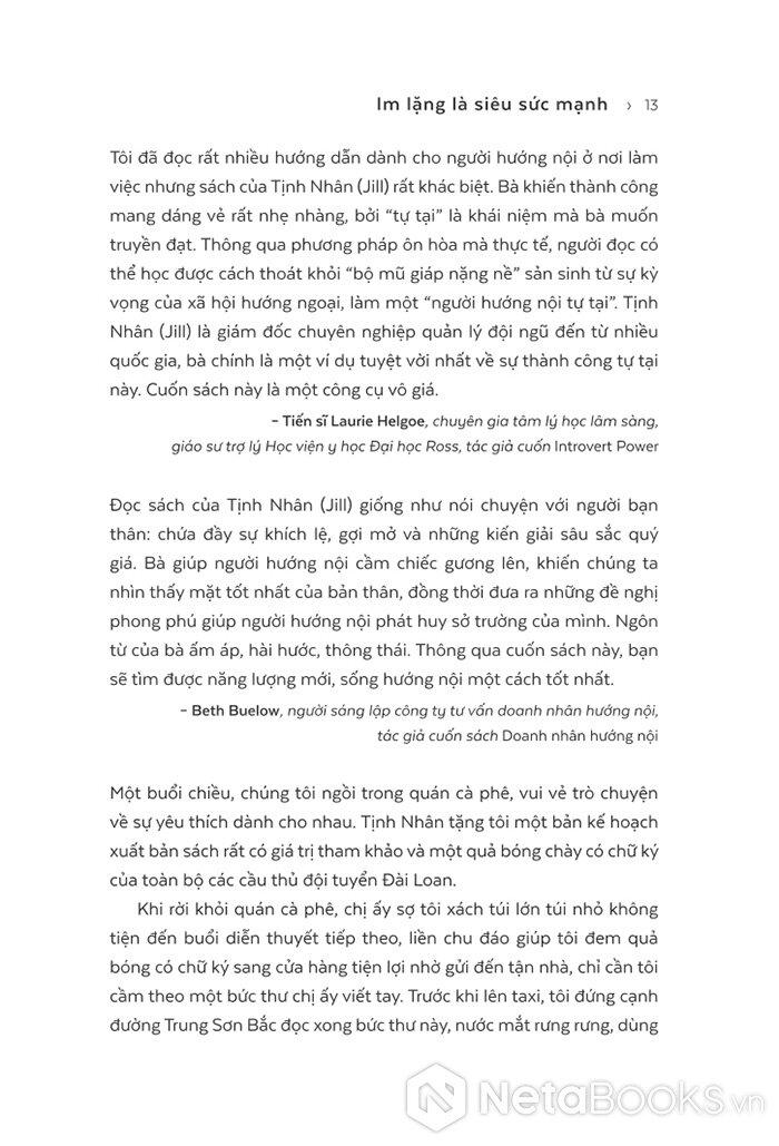 Sách của Tịnh Nhân (Jill) đem lại sự tự tin và sức mạnh cho những người im lặng, có tư duy chu toàn nhưng đôi lúc bị đánh giá thấp một cách thiếu công bằng. Là một người hướng nội, bà cho thấy người hướng nội có thể đem lại ưu thế và năng lực khác biệt cho nơi làm việc. Đây là một cuốn sách thẳng thắn, xuất sắc, khiến người hướng nội như bạn cũng có thể tỏa sáng rực rỡ. – Tiến sĩ Doris Martin, nhà tư vấn đào tạo doanh nghiệp nổi tiếng người Đức, tác giả cuốn Mật mã thành công của người hướng nội