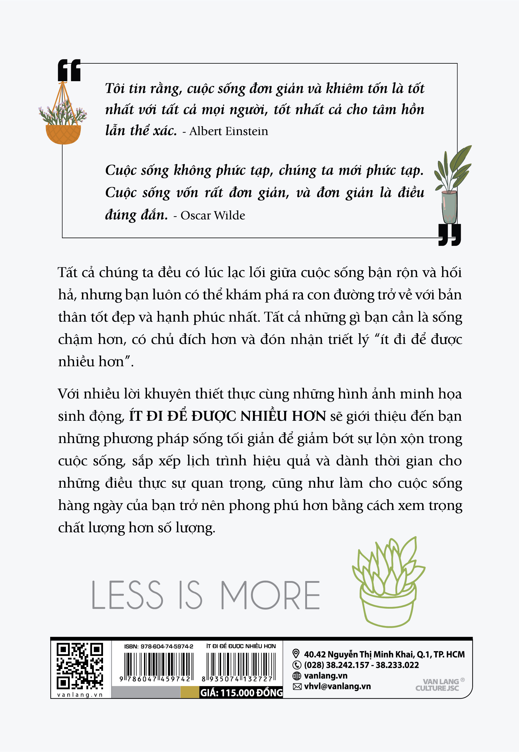 Mua tại TiktokÍt đi để được nhiều hơn-Vanlangbooks I.Giới thiệu sách Ít Đi Để Được Nhiều Hơn - Less Is More “Tôi tin rằng, cuộc sống đơn giản và khiêm tốn là tốt nhất với tất cả mọi người, tốt nhất cả cho tâm hồn lẫn thể xác.”