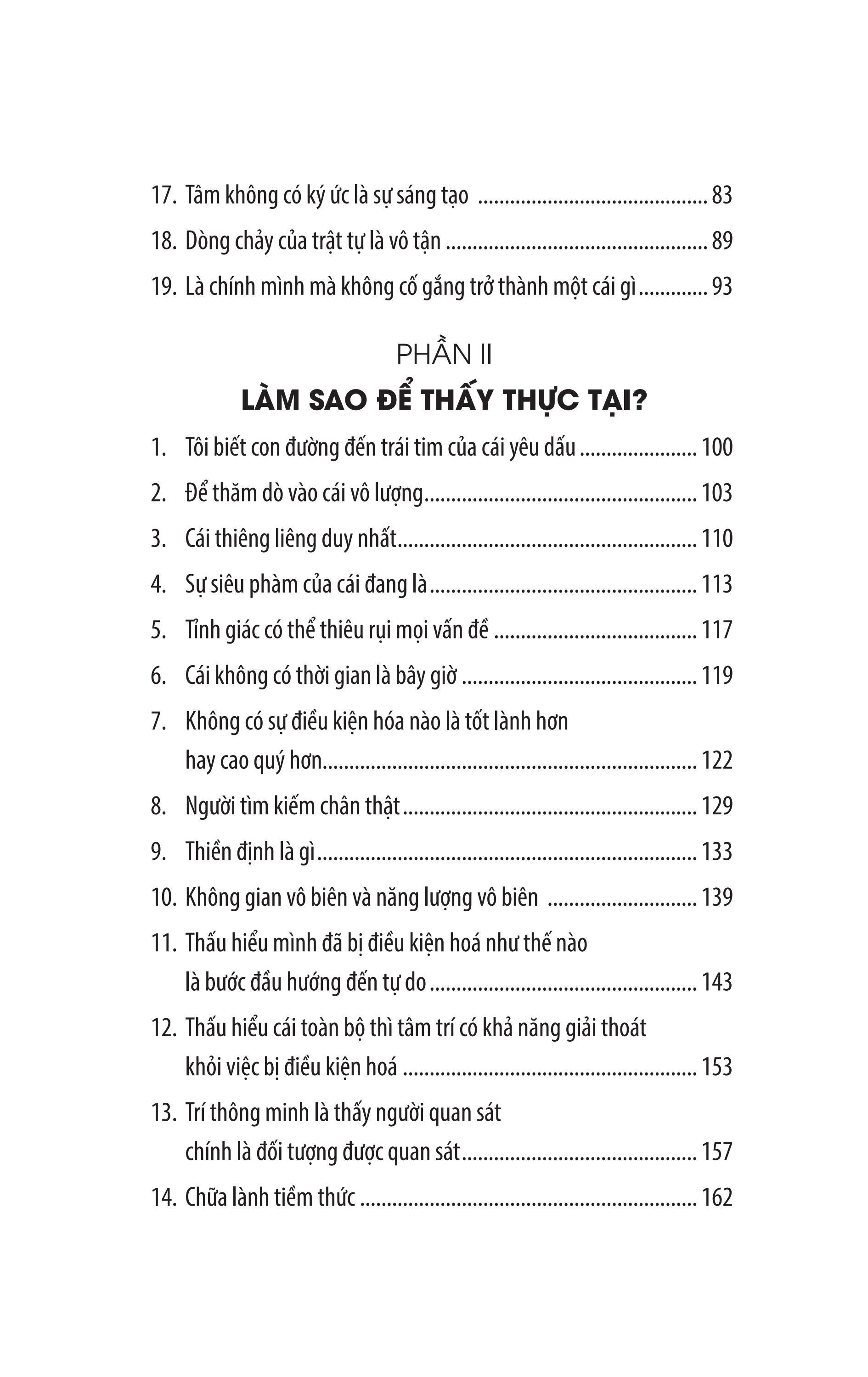 Thông qua ba phần lớn Trước Mắt Bạn Là Cái Gì - Làm Sao Để Thấy Thực Tại - Thực Tại Hiện Tiền, cuốn sách J. Krisnamurti Thực Tại Hiện Tiền sẽ bàn về những điều sâu sắc và đẹp đẽ đó, những điều tưởng như mờ hồ nhưng luôn hiện hữu quanh ta và ảnh hưởng tới toàn bộ đời sống thân và tâm của chúng ta.