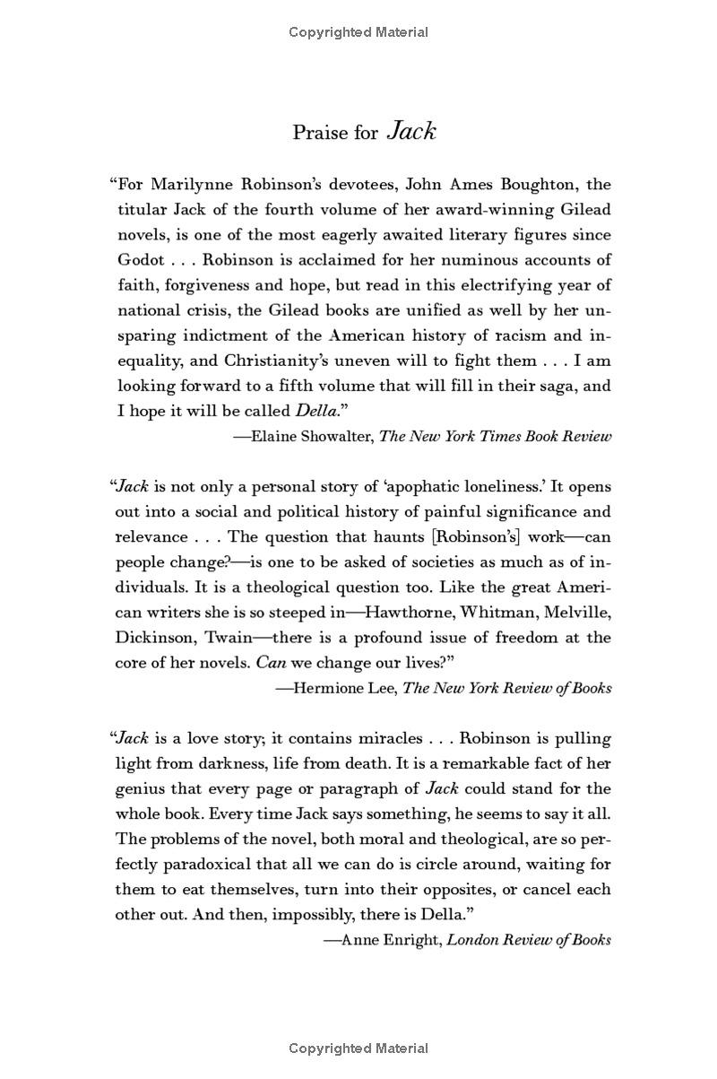 Jack is Robinson’s fourth novel in this now-classic series. In it, Robinson tells the story of John Ames Boughton, the prodigal son of Gilead’s Presbyterian minister, and his romance with Della Miles, a high school teacher who is also the child of a preacher. Their deeply felt, tormented, star-crossed interracial romance resonates with all the paradoxes of American life, then and now.