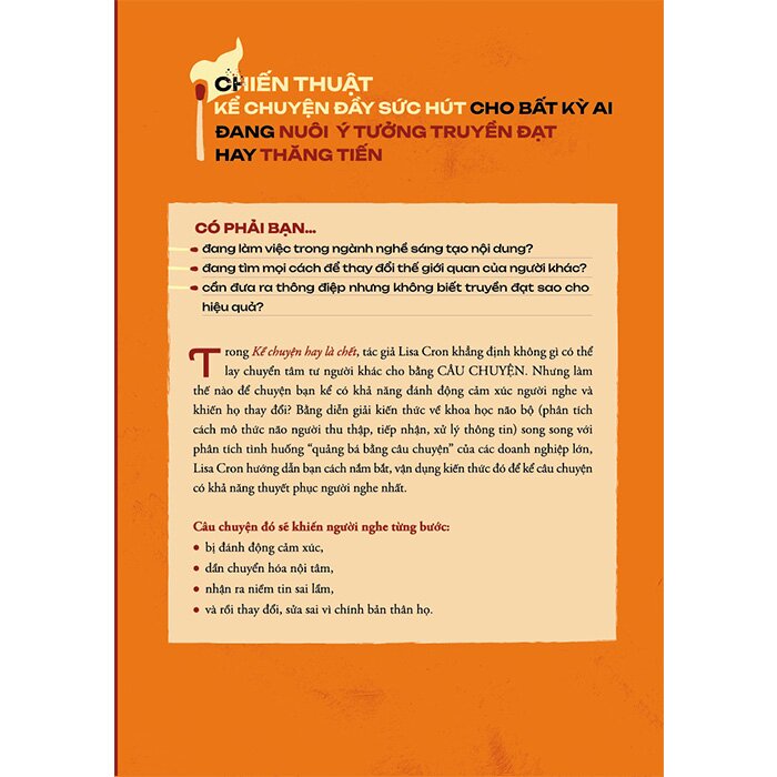 Trong Kể chuyện hay là chết, tác giả Lisa Cron khẳng định không gì có thể lay chuyển tâm tư người khác cho bằng CÂU CHUYỆN. Nhưng làm thế nào để chuyện bạn kể có khả năng đánh động cảm xúc người nghe và khiến họ thay đổi? Bằng diễn giải kiến thức về khoa học não bộ song song với phân tích tình huống “quảng bá bằng câu chuyện” của các doanh nghiệp lớn, Lisa Cron hướng dẫn bạn cách nắm bắt, vận dụng kiến thức đó để kể câu chuyện có khả năng thuyết phục người nghe nhất.