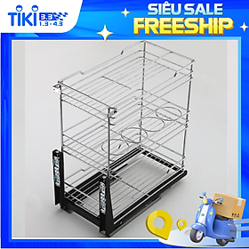 Giá đa năng để giao thớt, chai lọ, gia vị Chất liệu: Inox 304 dạng nan tròn Phiên bản bắt cánh ngăn kéo và mở cánh Ray âm giảm chấn Angas Độ rộng cánh: 300mm