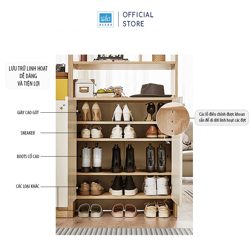 - Phần tủ dưới được trang bị nhiều ngăn và các đợt di động (được khoan sẵn lỗ) giúp bạn cất giữ nhiều loại giày dép một cách thông minh.