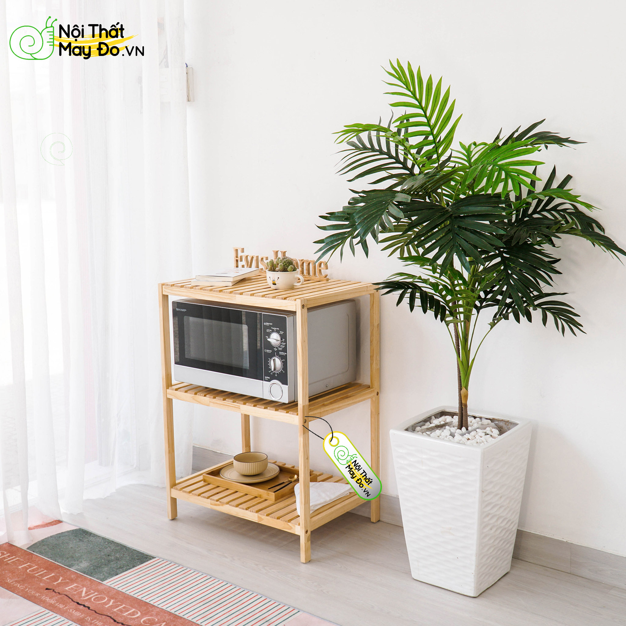 Mỗi mặt kệ được cấu tạo bởi nhiều thanh gỗ nhỏ, điều này giúp không khí có thể lưu thông tốt giữa 3 ngăn kệ, giảm bớt hơi nóng và mùi hôi của lò vi sóng trong quá trình sử dụng.