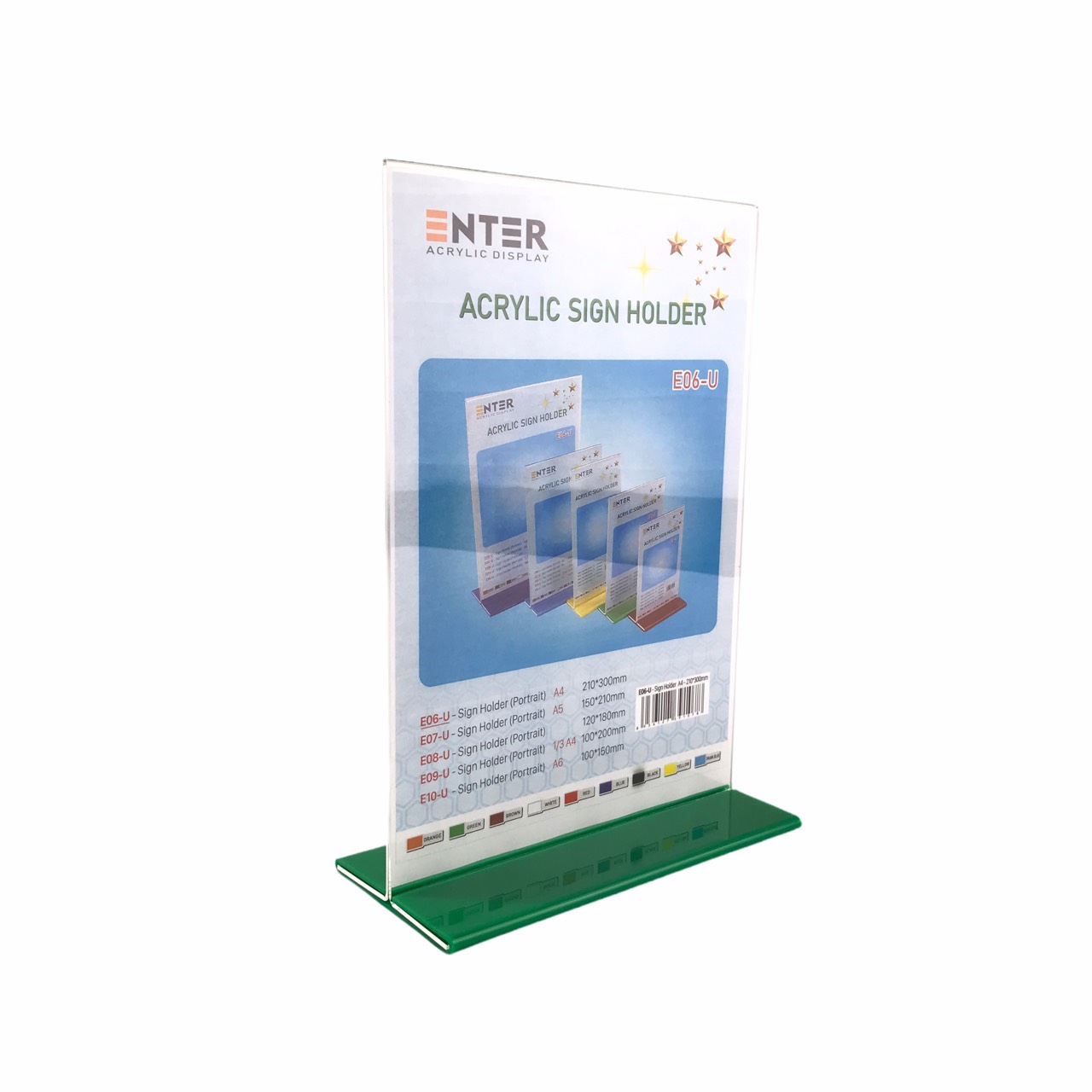 Mô tả sản phẩm Mã barcode Quy cách Đơn vị tính Đóng gói Thương hiệu Xuất xứ E06 Thân mica 210 x 300mm Đế mica 210 x 100mm Cái/Thùng 1/10 Enter Việt Nam E07 Thân mica 150 x 210mm Đế mica 150 x 70mm Cái/Thùng 1/20 Enter Việt Nam E08 Thân mica 120 x 180mm Đế mica 120 x 70mm Cái/Thùng 1/20 Enter Việt Nam E09 Thân mica 100 x 210mm Đế mica 100 x 70mm Cái/Thùng 1/20 Enter Việt Nam